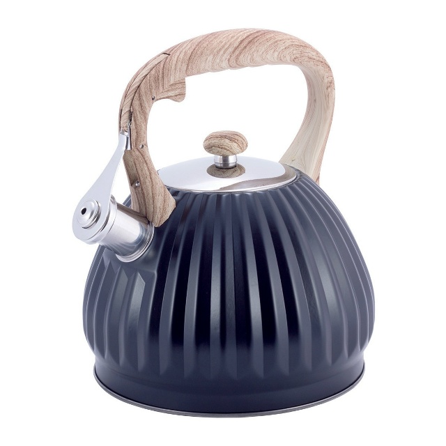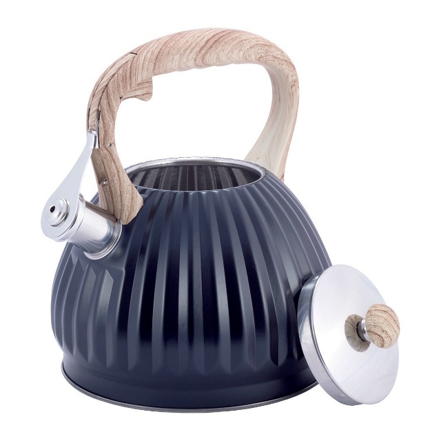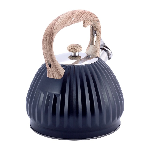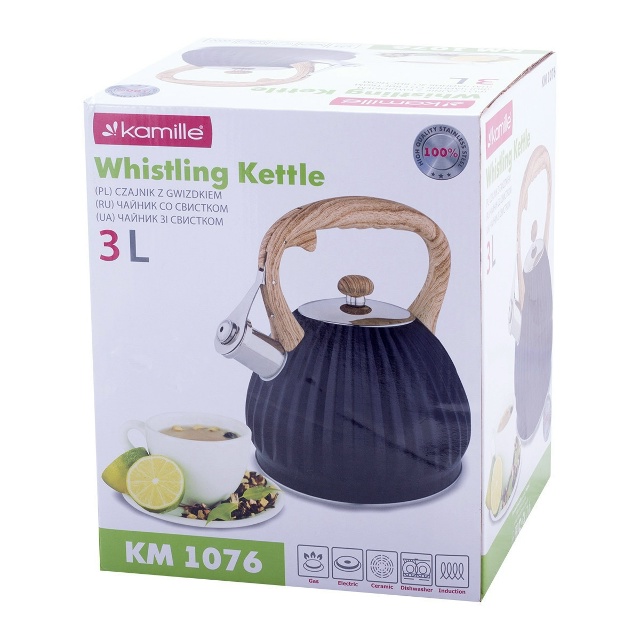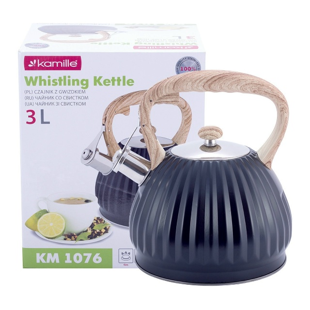 Чайник 3 л. из нержавеющей стали со свистком Kamille KM-1076 черный с ручкой под дерево.