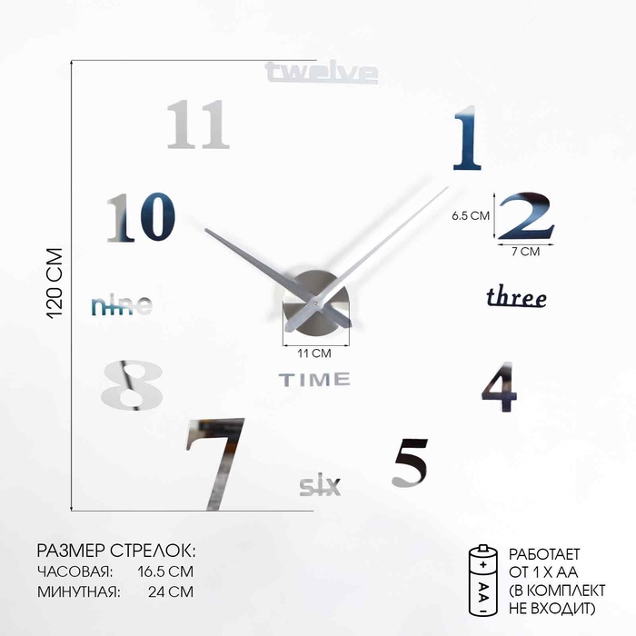 Страна: Китай В боксе: 20 шт Состав: Акрил, металл, пластик Материалы: акрил, металл, пластик Фасовка: по 1 шт Индивидуальная упаковка: Картонная коробка Сертификат: ЕАС Цвет: Серебристый Ширина, см: 120 Высота, см: 120 Тематика: Интерьер Тип индикации: Арабские цифры Тип механизма: Кварцевый Материал: Акрил, Металл 3D: Да Ход стрелок: Плавный Бесшумные: Да Фиксированная цена: Да Оригинальные большие 3D часы-наклейка DIY диаметром от 80 см до 120 см серебряного цвета. Клеевой слой позволяет разместить часы на различные поверхности: окрашенные, деревянные, пластиковые, керамические или металлические, а также любые виды обоев. В комплекте к часам идет шаблон для разметки. С его помощью вы сами выбираете желаемый диаметр часов и делаете отметки на стене, куда будут клеиться элементы. Характеристики