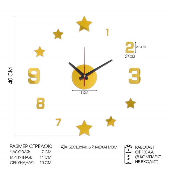 Страна: Китай В боксе: 120 шт Состав: Акрил Материалы: акрил Фасовка: по 1 шт Индивидуальная упаковка: Картонная коробка Сертификат: ЕАС Цвет: Серебристый Тип индикации: Арабские цифры Тип механизма: Кварцевый Материал: Акрил 3D: Да Бесшумные: Да Настенные часы в виде звёздочек дополнят декор и интерьер вашего дома и станут отличным подарком близким людям. Стильные и красивые часы на стену с бесшумным кварцевым механизмом будут украшением любой комнаты: гостиной, спальни, зала или офиса. Они работают на батарейке типа АА (в комплект не входит), имеют регулируемые размеры циферблата и 3д эффект благодаря вспененной основе. Клеящий слой позволяет разместить часы на различные поверхности: любые виды обоев, окрашенные, деревянные, пластиковые, керамические или металлические. Декоративные часы дополнят интерьер квартиры или дачи. Оригинальные часы станут отличным подарком женщине, девочке, подростку, коллеге на Новый год, Рождество, 8 марта, юбилей, День Рождения или свадьбу. Комментарии к товару