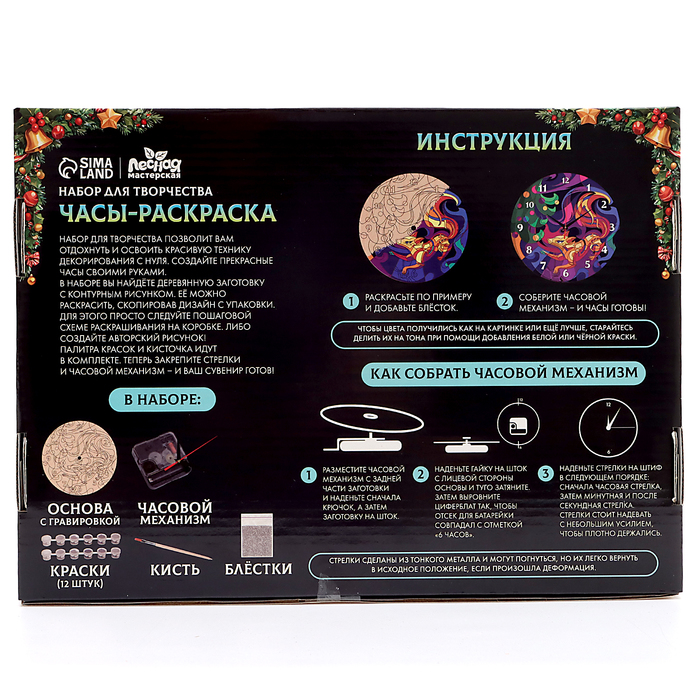 Габариты: 30,5 x 22 x 3,5 Страна: Китай В боксе: 28 набор Состав: Акрил, дерево, картон, металл, пластик Материалы: акрил, дерево, картон, металл, пластик Фасовка: по 1 набор Индивидуальная упаковка: Цветная картонная коробка Габариты товара: 30 см × 22 см × 3,5 см Сертификат: ЕАС Количество цветов: 12 Для кого: Унисекс Возраст: От 3 лет Тематика: Новогодняя Символ года: Нет Тематика праздника: Новый год Адресат: Без адресата Возраст: Любой Материал: Дерево Вид: По дереву Составляющие набора: Часы Техника выполнения: Роспись, раскраска Вид заготовки: Часы Комплектация набора: С блёстками, С красками, С кистью (-ями) Фиксированная цена: Да С набором для росписи по дереву вы сможете создать яркие и оригинальные часы. Особенности набора