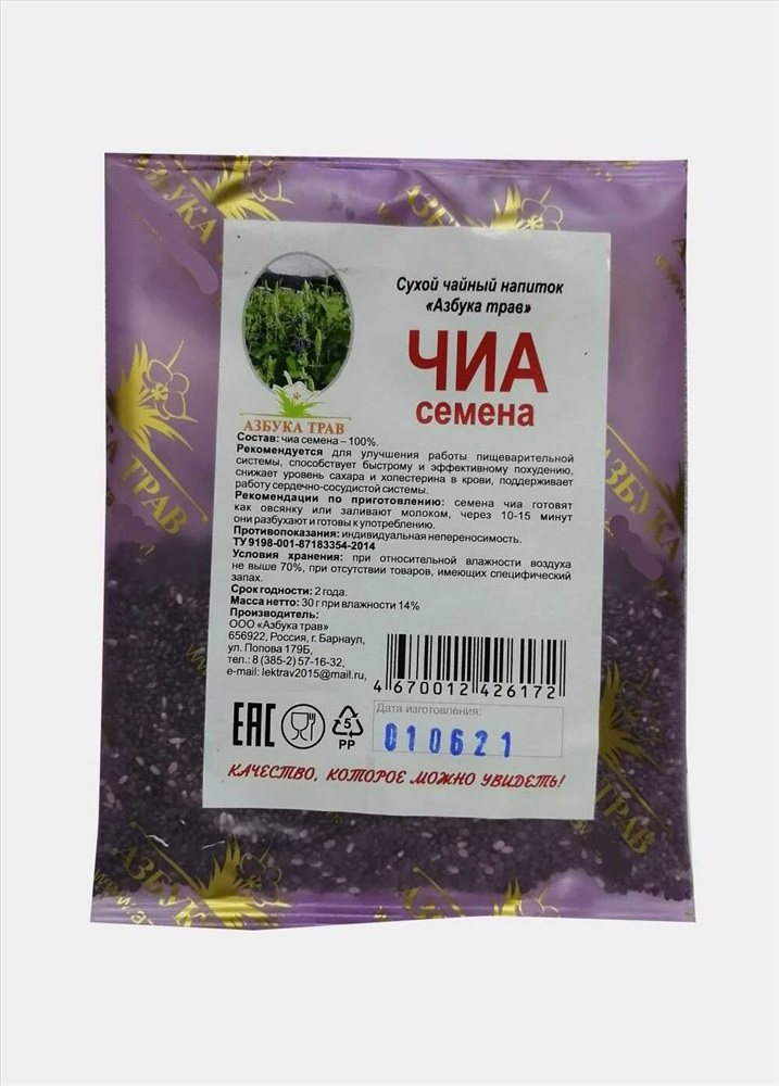 Семена чиа натуральный и экологический продукт, богат витаминами и минералами, прекрасный источник антиоксидантов, подходит для диабетиков, способствует быстрому и эффективному похудению. Семена чиа содержат большое количество омега-3 кислот, антиоксиданты, витамины (B3, B2, B1, A) и минералы (кальций, железо, калий, цинк, бор, медь, фосфор, селен, натрий) и благотворно влияют на правильное функционирование всего организма. Улучшают работу пищеварительной системы, благодаря жирным кислотам поддерживают работу сердечно-сосудистой системы, снижают уровень сахара и холестерина.