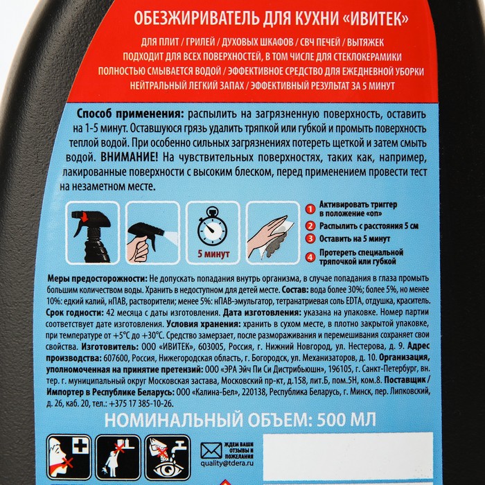Габариты: 5 x 10 x 26,5 Доставка: Платная Страна: Россия В боксе: 15 шт Состав: См. на упаковке Материалы: см. на упаковке Фасовка: по 1 шт Индивидуальная упаковка: Без упаковки Сертификат: Не подлежит сертификации Вес, г/Объём, мл: 500 Назначение: Для кухонной техники Супер быстрый эффект за 10 секунд! Особое средство для мгновенного удаления самых стойких застарелых и подгоревших масложировых загрязнений, нагара, копоти с поверхностей кухонных плит, духовых шкафов, грилей, кастрюль, сковородок, с прочих поверхностей для приготовления пищи, пароуловителей, кафельной плитки в том числе и с охлажденных поверхностей. Способ применения: нанести средство с помощью распылителя с расстояния 15-20 см на загрязненную поверхность, подождать, 10-15 секунд, потереть влажной тряпкой и смыть водой. Меры предосторожности: может вызвать коррозию металлов. При попадании на кожу и в глаза вызывает химические ожоги. Не допускать попадания средства в глаза, на кожу, слизистые оболочки, не вдыхать. Состав: очищенная вода 30%, гидроксид калия 5%, растворители 5%, неиногенные поверхностно-активные вещества 5%, загуститель 5%, краситель 5%, отдушка 5%. Комментарии к товару