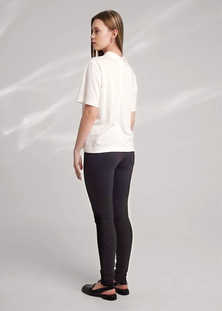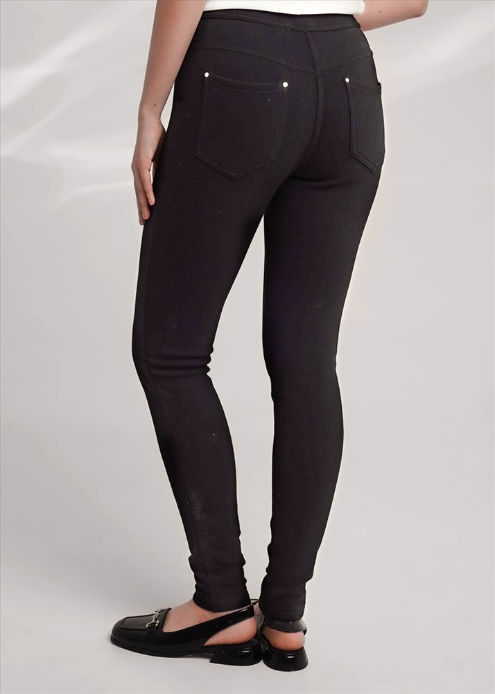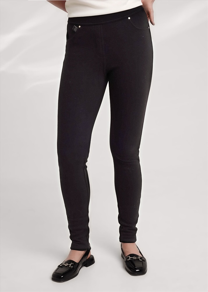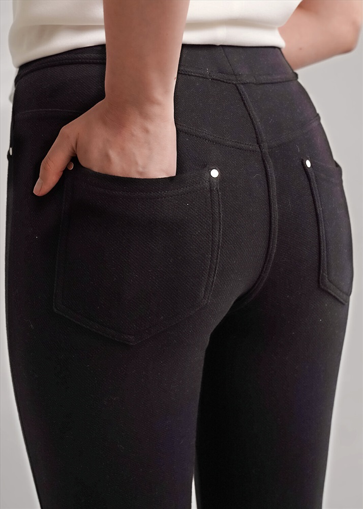 Брюки прилегающего силуэта из трикотажного полотна с мехом. По талии пояс. По спинке кокетка и накладные карманы. Спереди нефункциональные карманы и ложный гульфик. По переду вдоль лосин защип-имитация лампаса. По деталям двойная отстрочка.