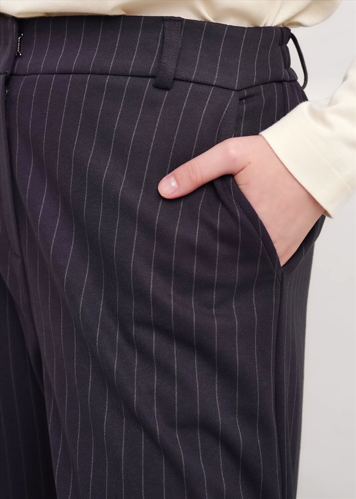 Брюки зауженные из поливискозного трикотажного полотна джерси. Притачной пояс со шлёвками, по спинке на внутренней резинке. Спереди гульфик с молнией и крючком. Боковые карманы с отрезным бочком.