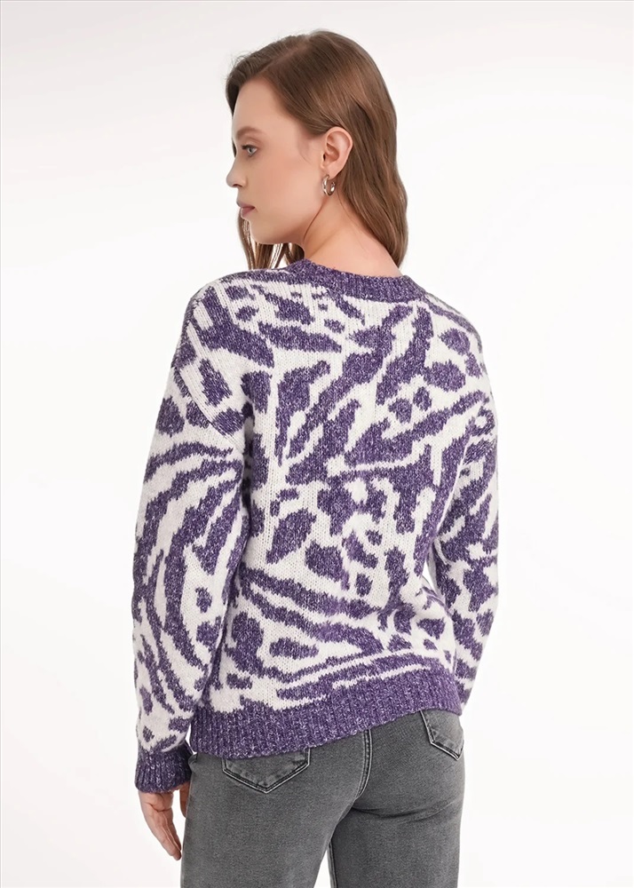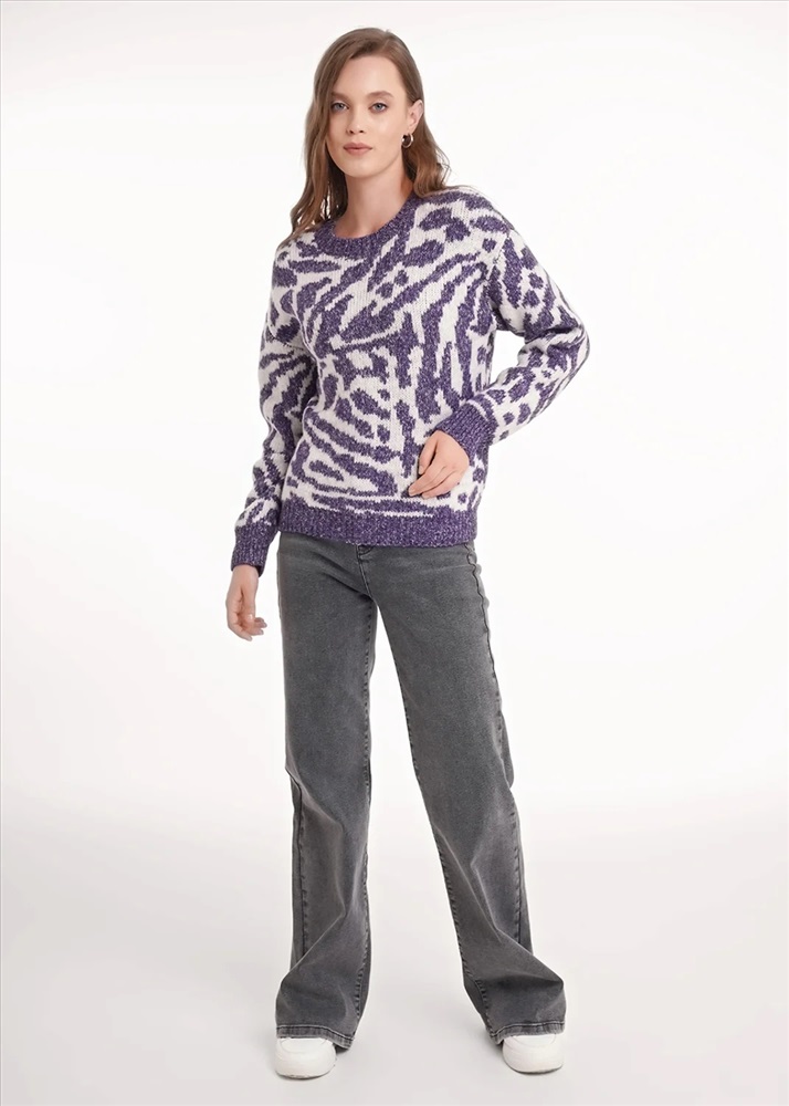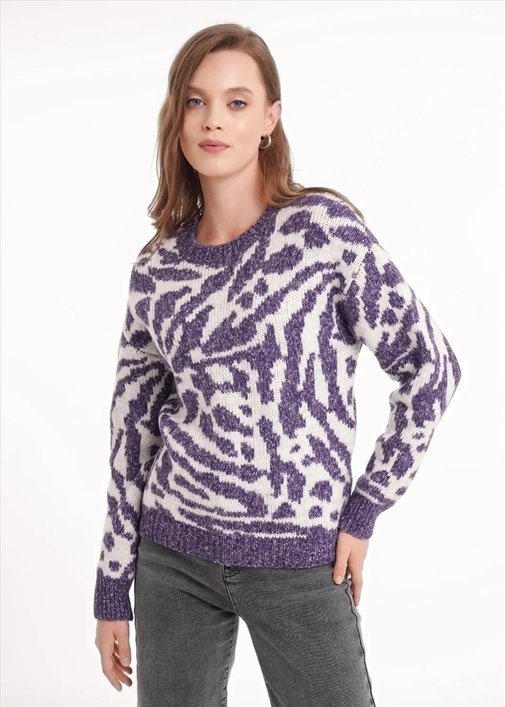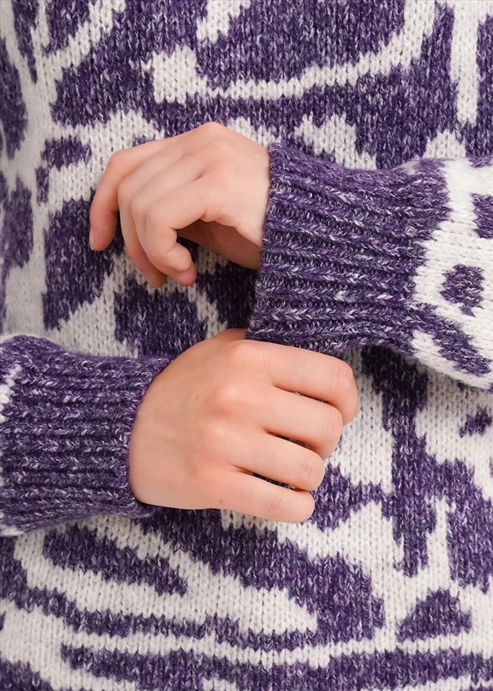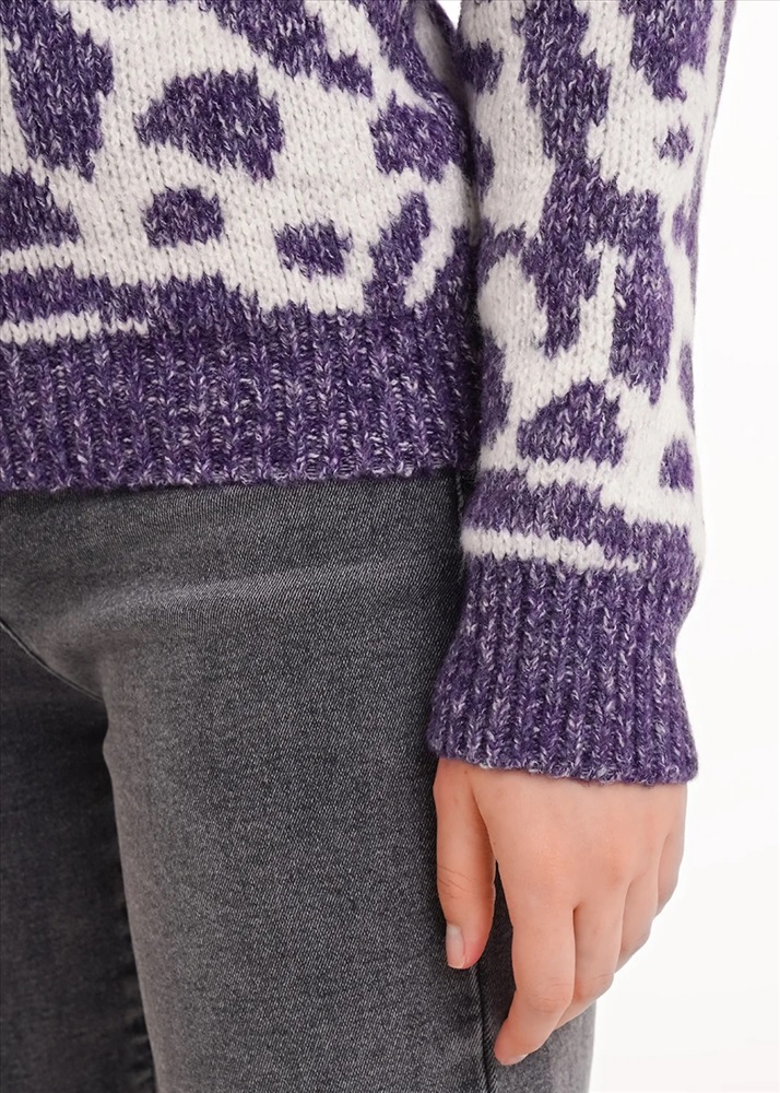 Вязаный джемпер прямого силуэта из акриловой пряжи с добавлением хлопка. Длинный втачной рукав. По низу рукава и изделия манжеты. Основное переплетение жаккард. Округлая горловина с бейкой.