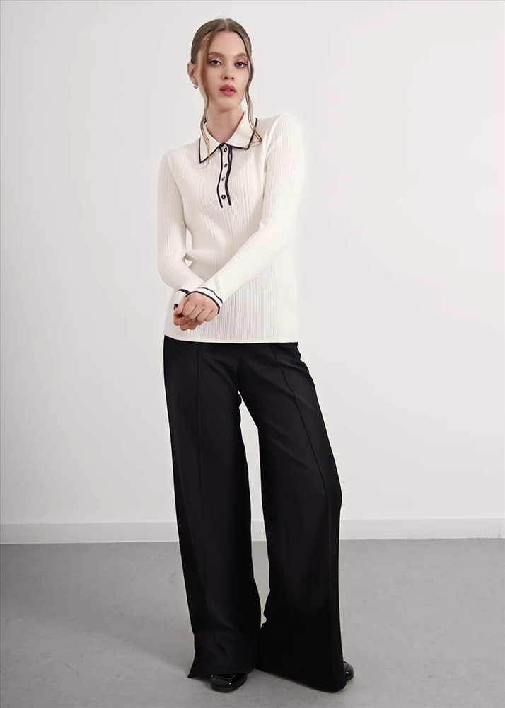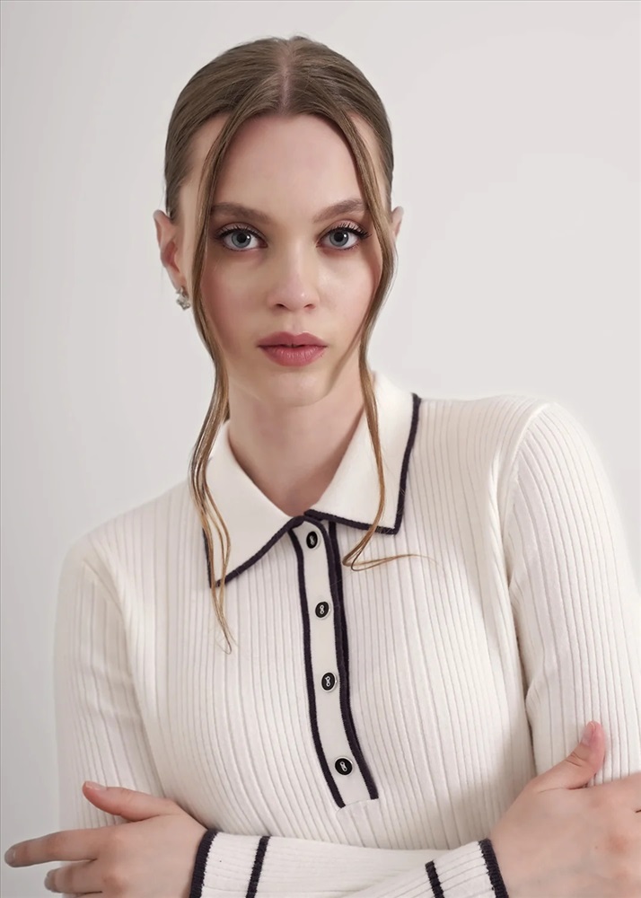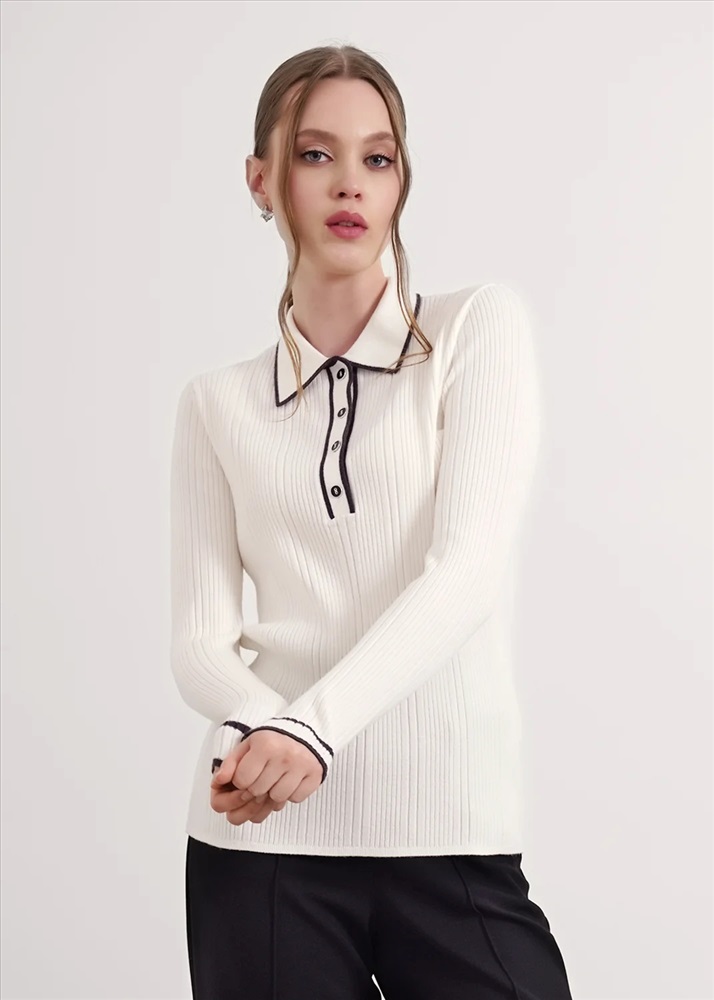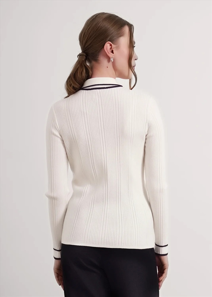 Джемпер из вискозной пряжи с добавлением нейлона, переплетение ластик. Длинный втачной рукав, расклешенный книзу. Контрастные полосы по низу рукава, воротнику и планке. По горловине отложной воротник с планкой и застежкой на пуговицы.