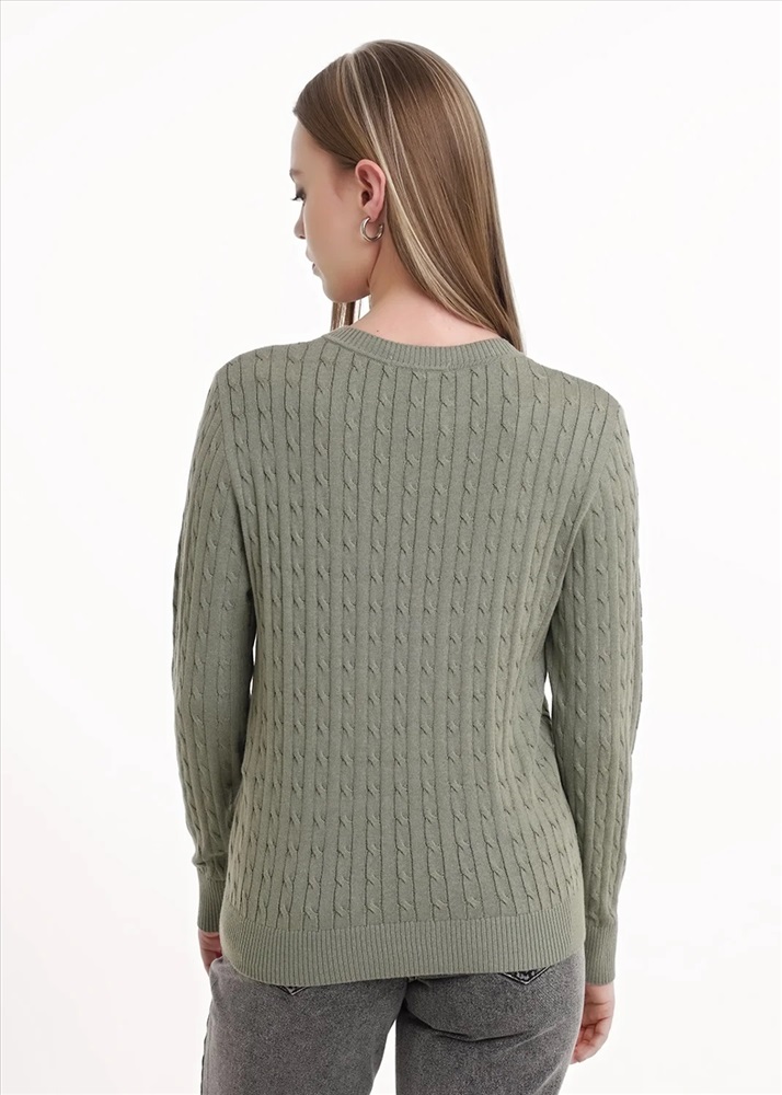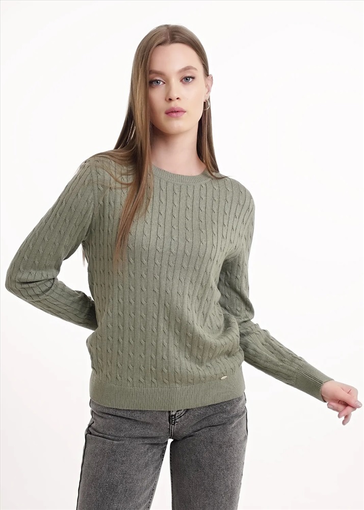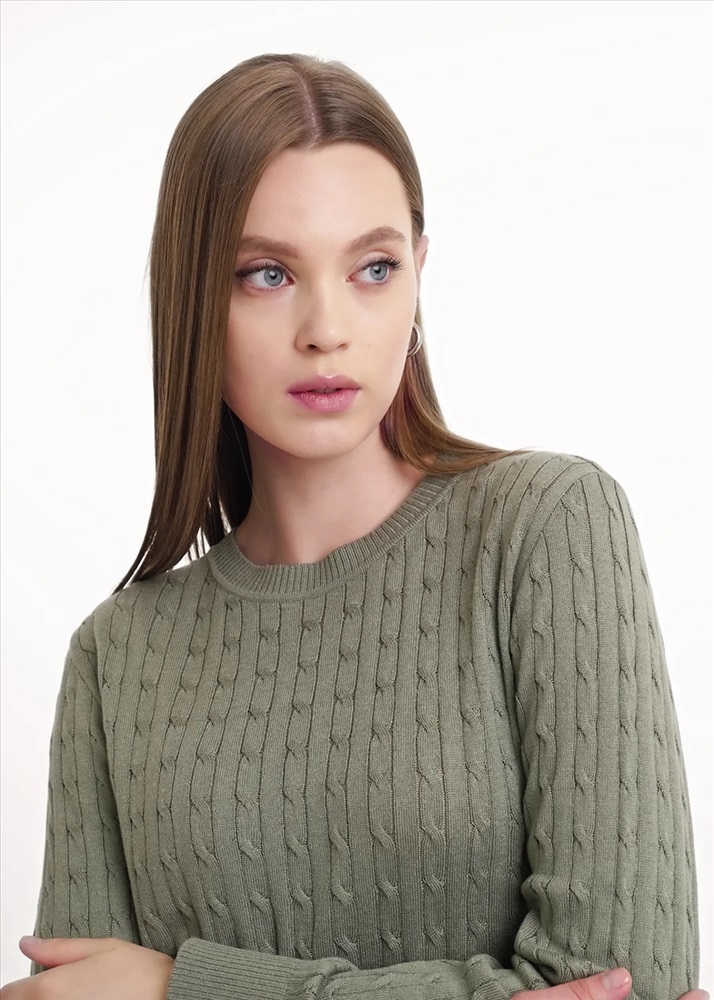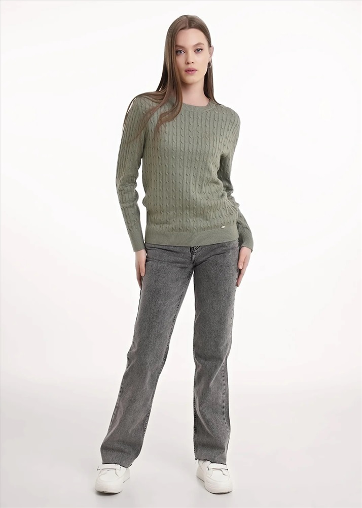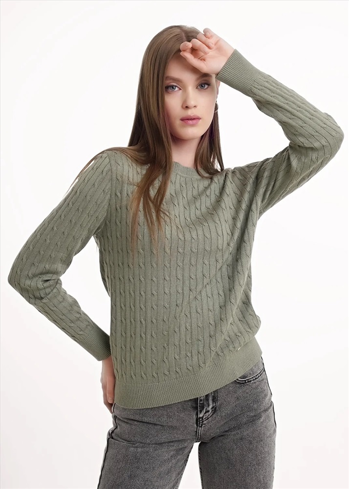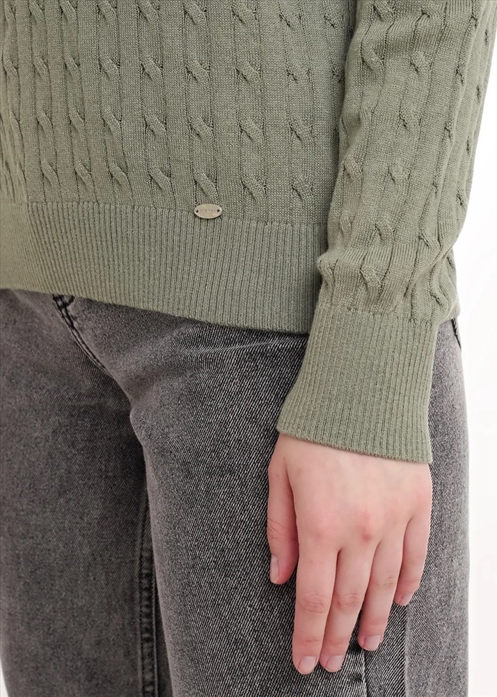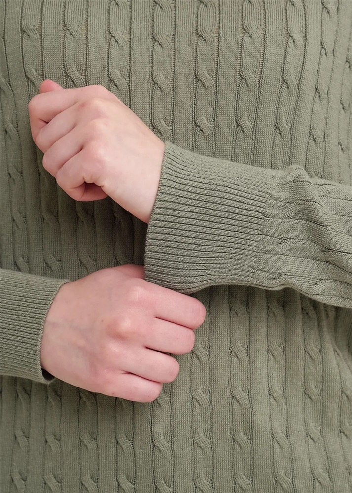Вязаный джемпер прямого силуэта из хлопковой пряжи с добавлением акрила, переплетение "косы". Втачной длинный рукав. Округлая горловина с бейкой. По низу изделия и рукавов манжеты.