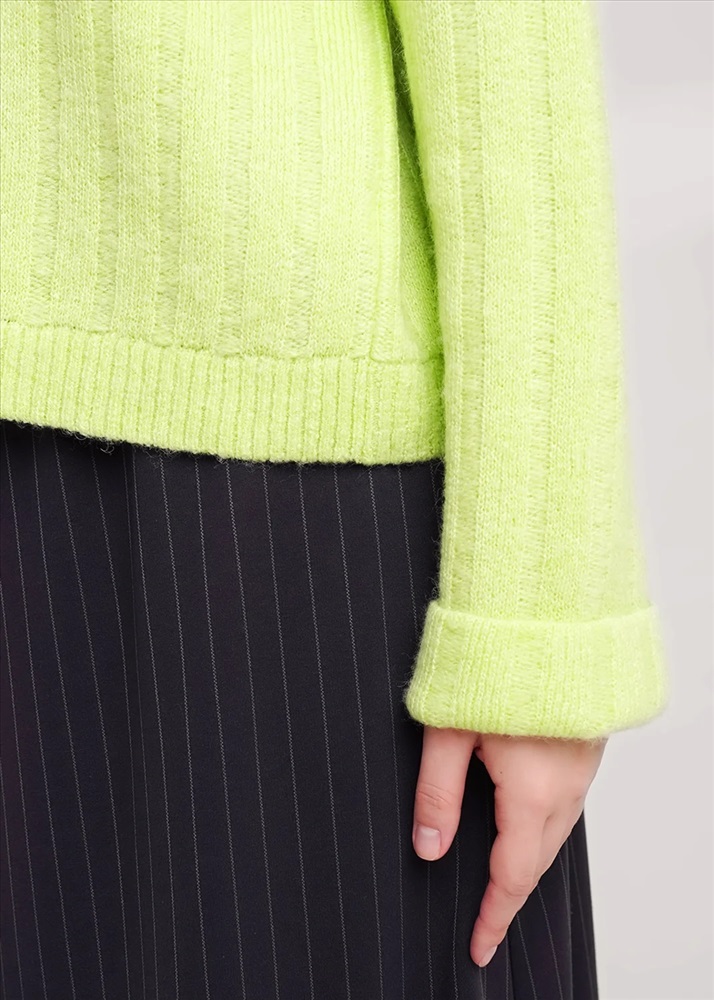 Вязаный джемпер из акриловой пряжи, переплетения широкий ластик 4*3, свободного силуэта. Длинный рукав со спущенной линией плеча, по низу рукава отворот. По горловине стойка с отворотом. По низу изделия манжет.