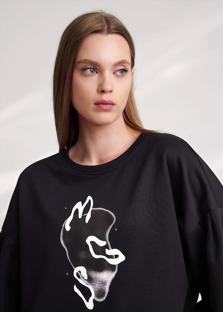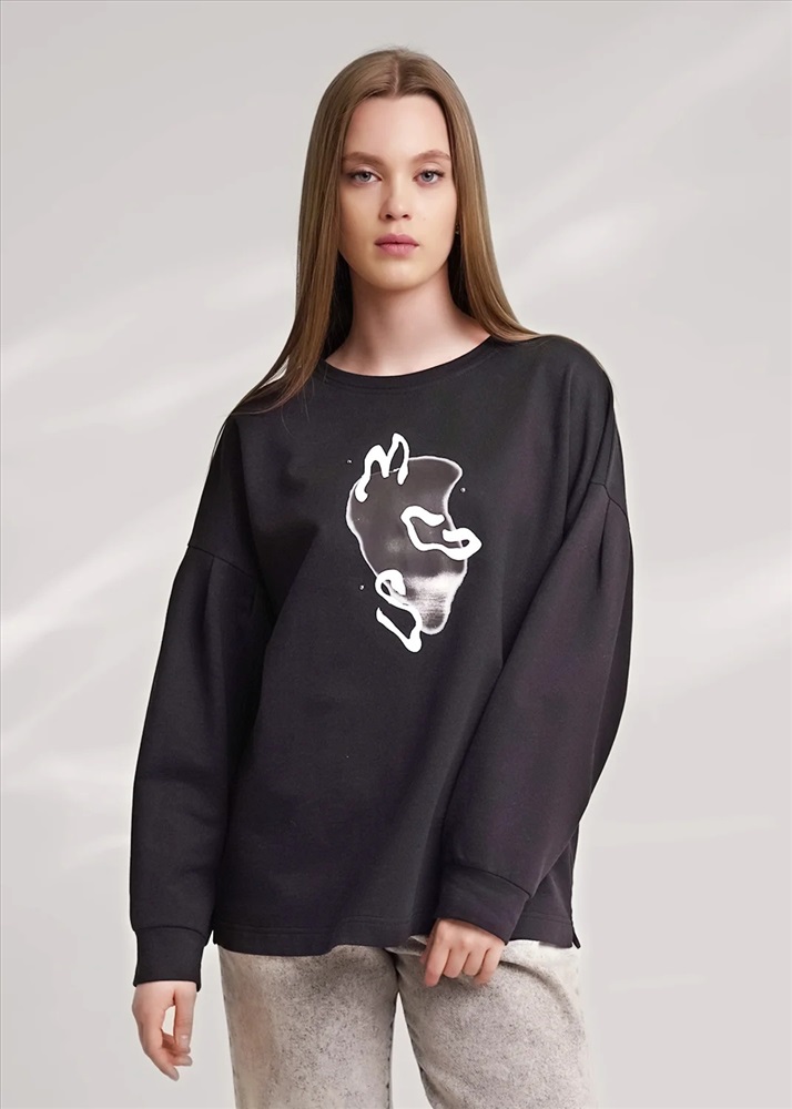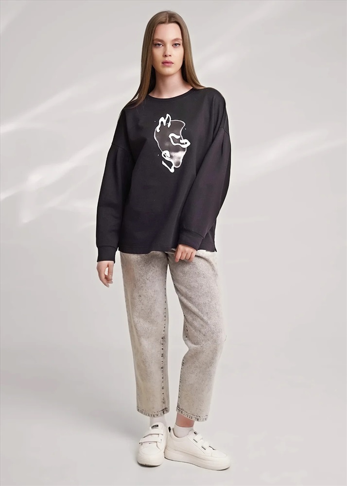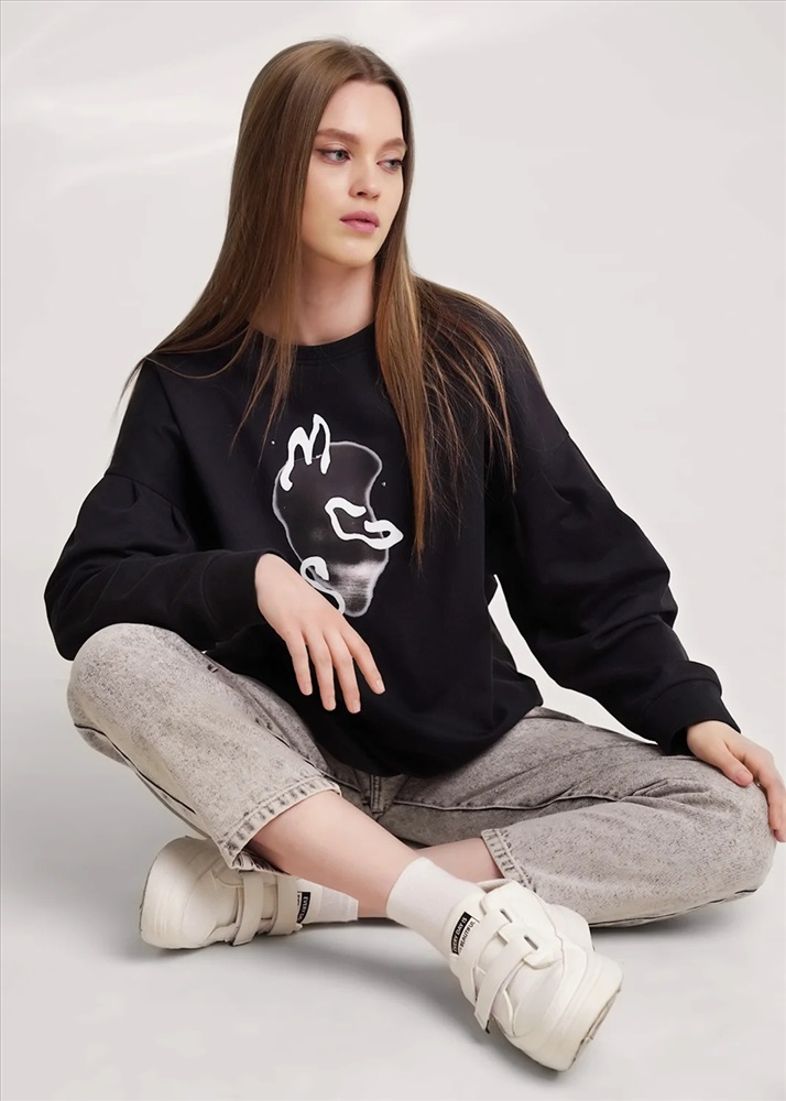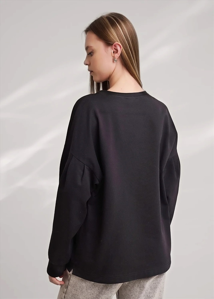 Джемпер из хлопкового трикотажного полотна футер,свободного кроя.Округлая горловина с обтачкой. Длинный рукав со спущенной линией плеча, внизу на манжете.По окату рукава складки.По низу изделия широкая подгибка с боковыми разрезами.Спереди термонаклейка.