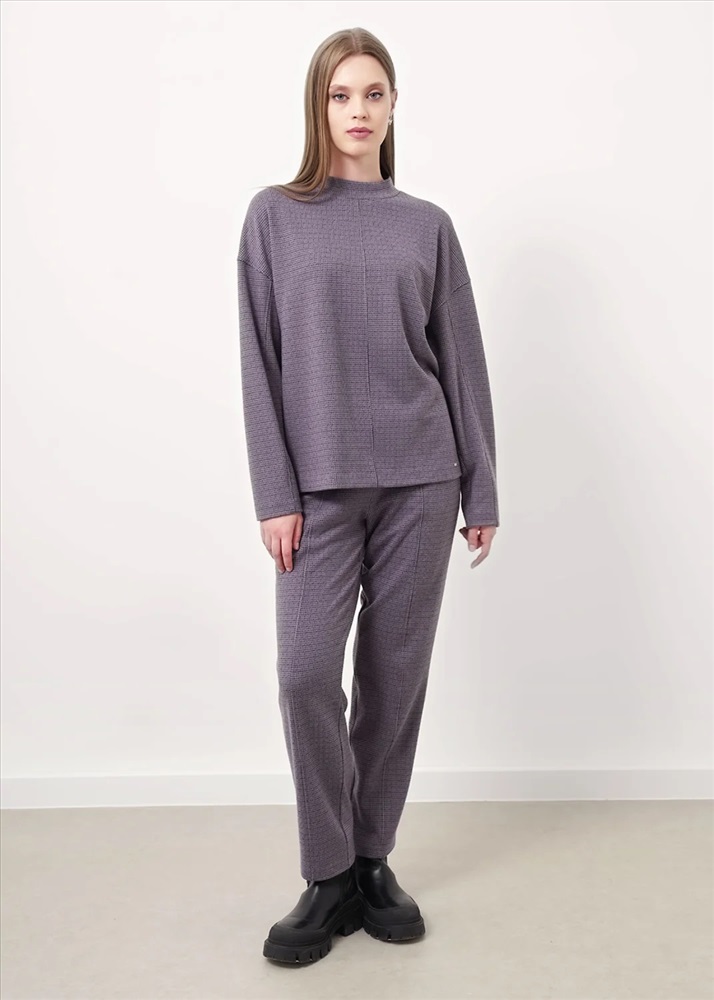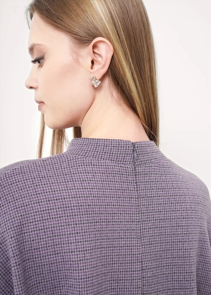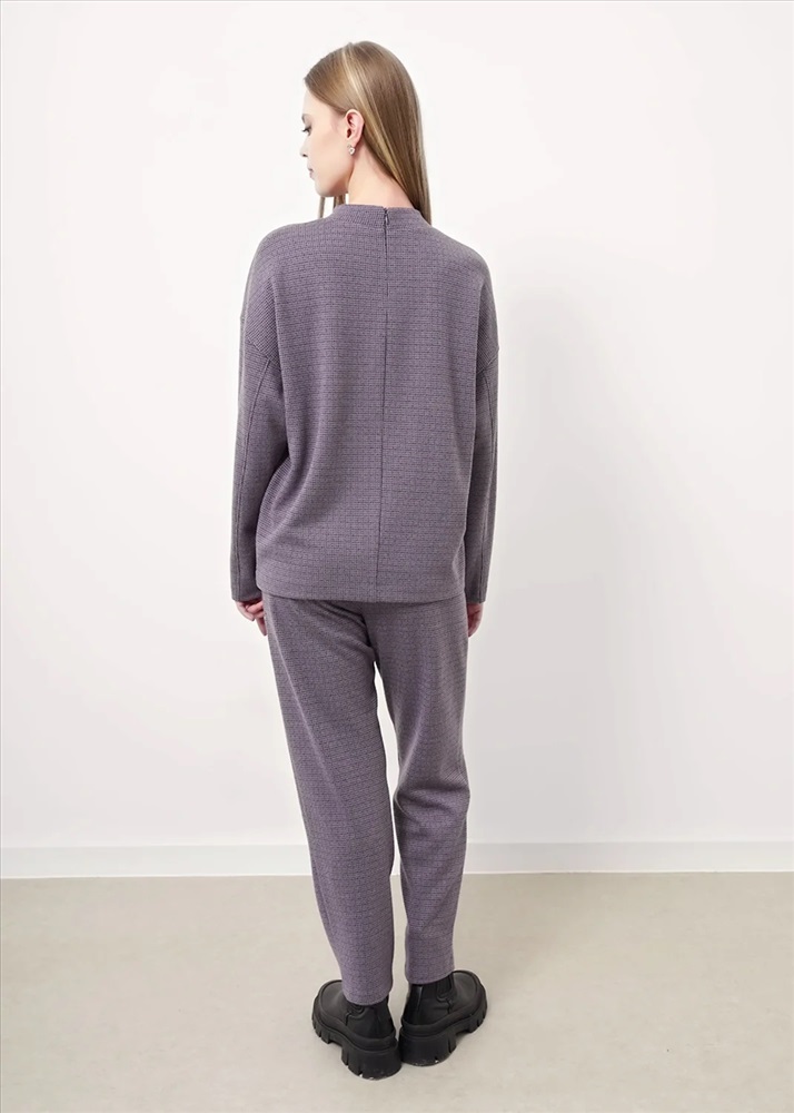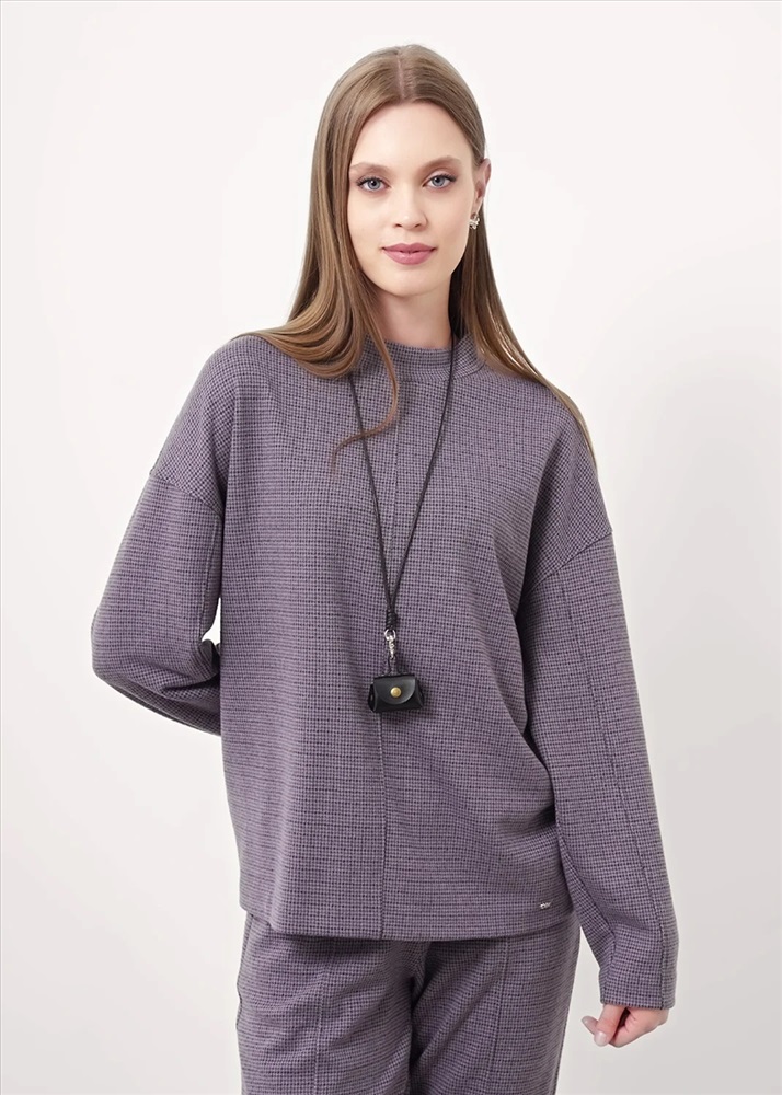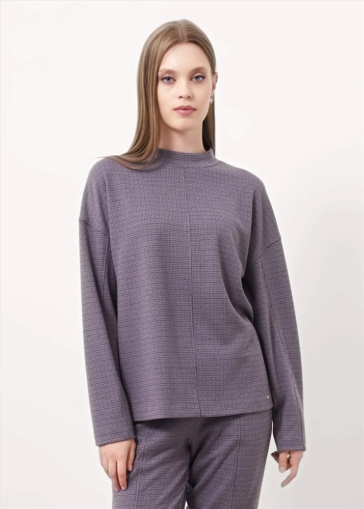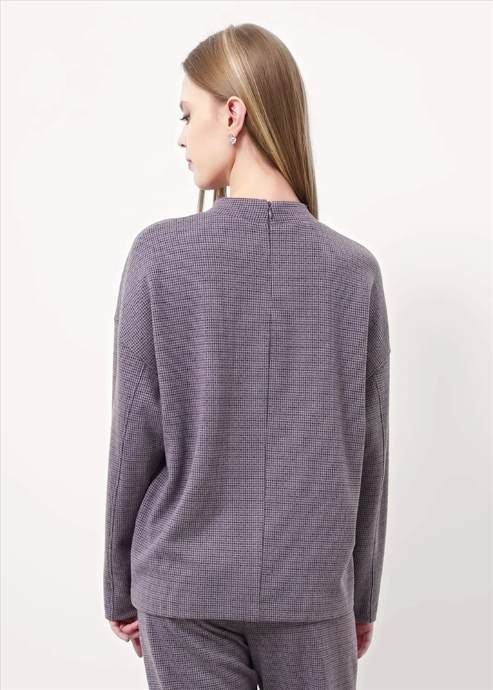 Джемпер объёмный из поливискозного трикотажного полотна джерси. Спущенный длинный рукав. По горловине стойка с молнией по спинке. По переду и спинке средний шов. По низу изделия потайной стежок. Спереди нашивка металл.