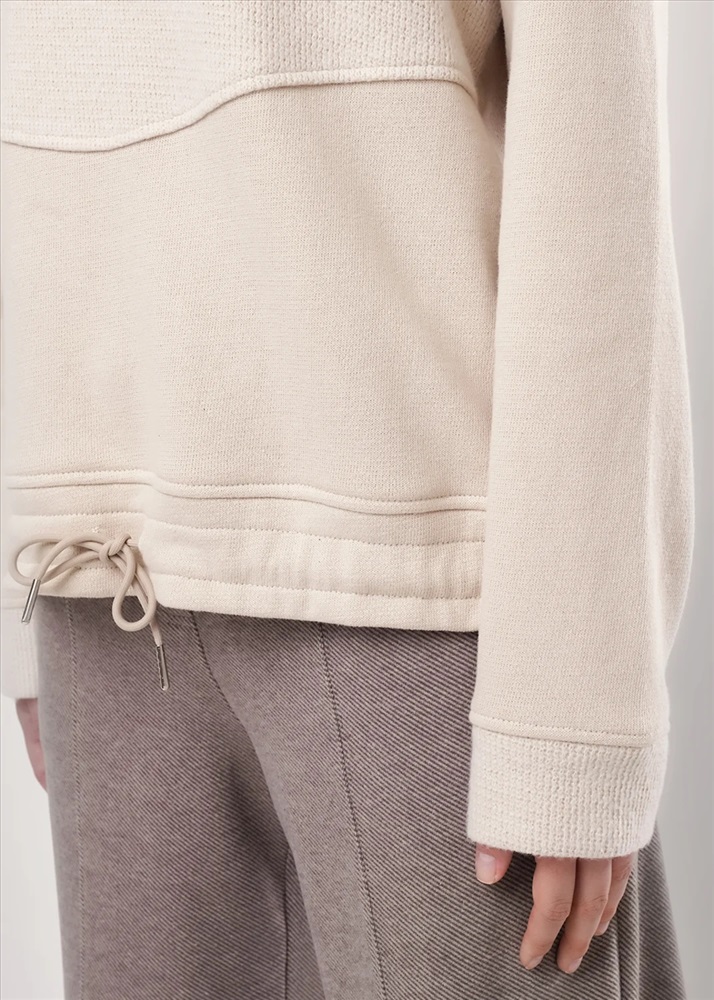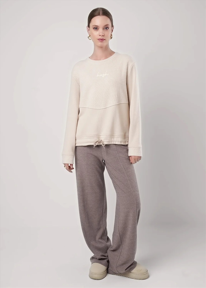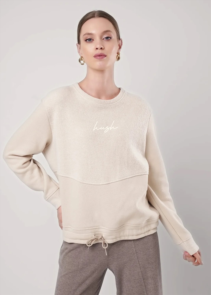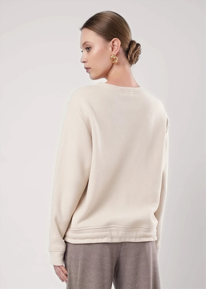 Джемпер из трикотажного полотна вискоза вязанная. Округлая горловина с обтачкой. Перед комбинированный (лицо,изнанка) фигурный рез. Втачной длинный рукав, внизу манжет (изнанка ворс). По низу изделия манжет со шнуром. Спереди вышивка.