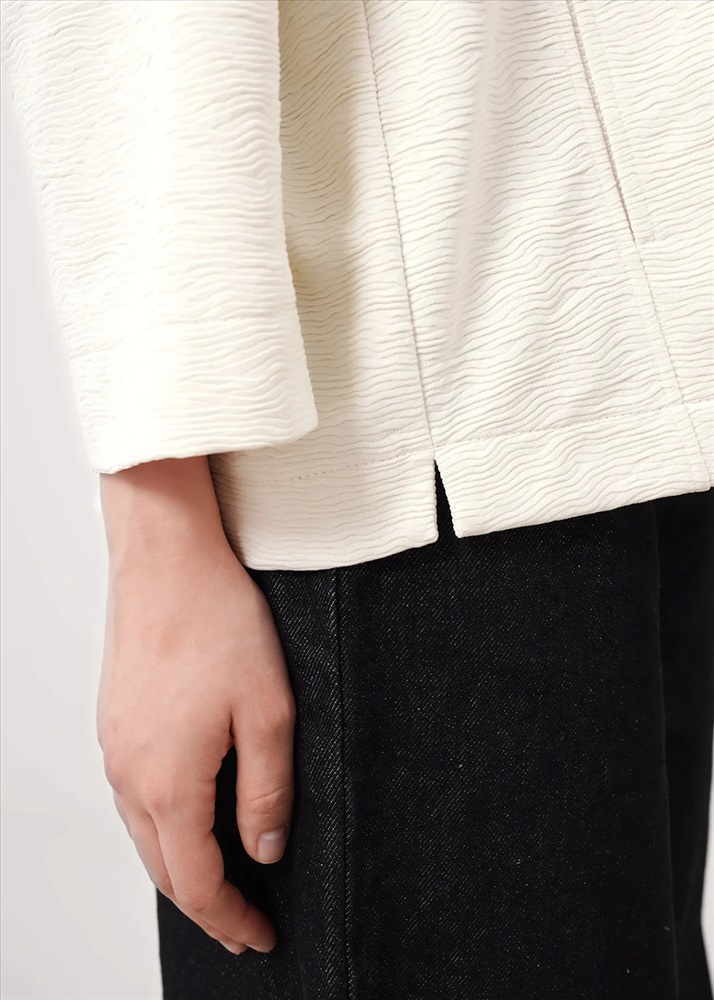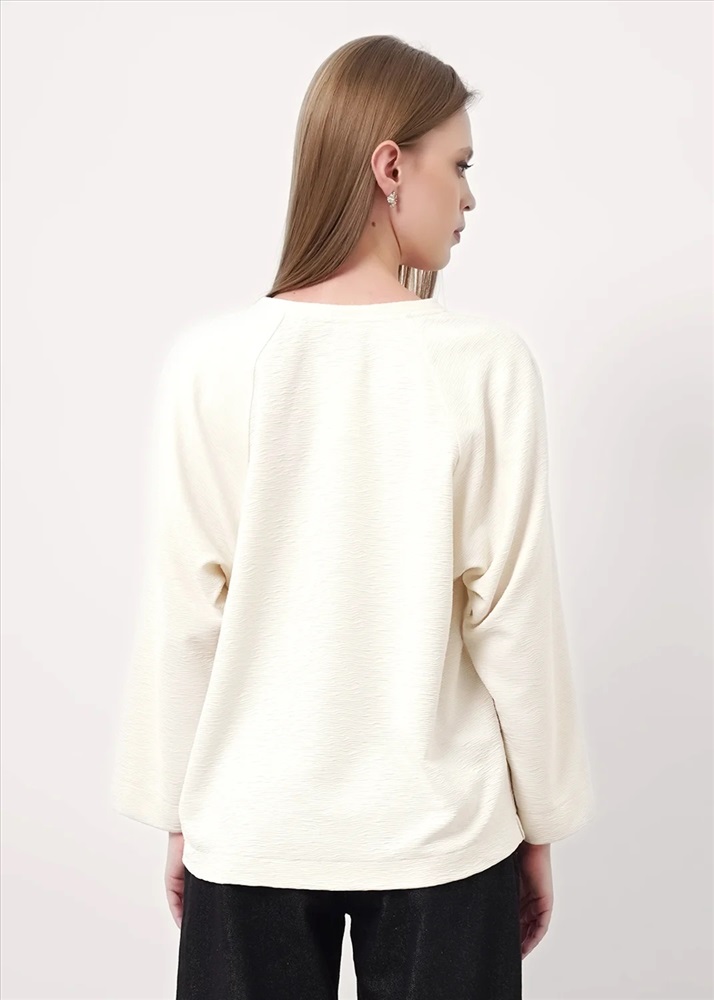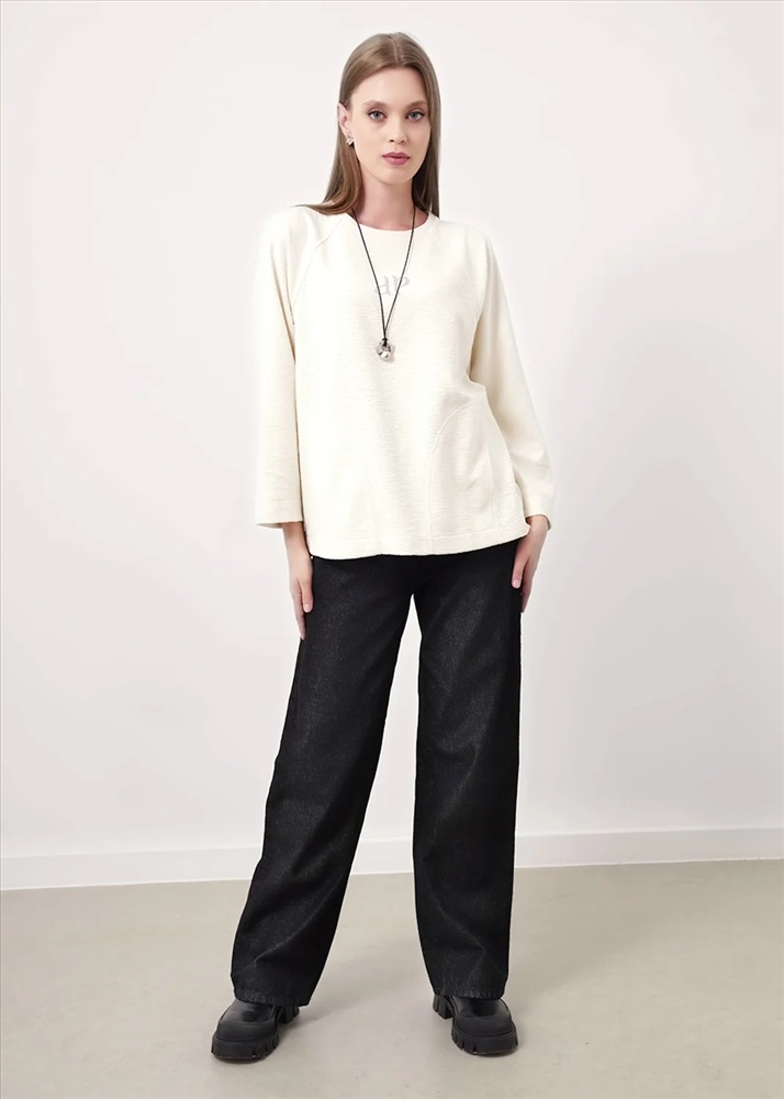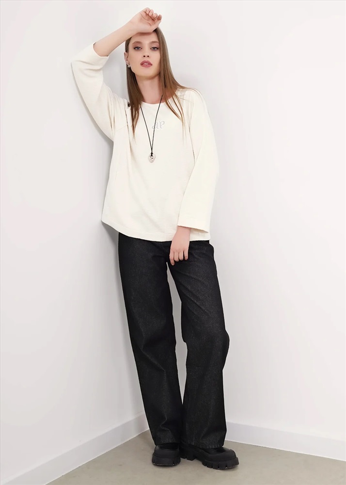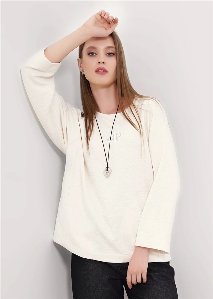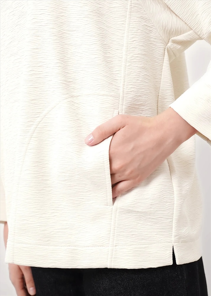 Джемпер прямого силуэта из трикотажного полотна джерси фактурное. Округлая горловина с обтачкой. Длинный рукав реглан,сверху по плечу вытачка. Спереди вертикальные резы с карманами в шве и закреплением мешковины. Боковые разрезы.Спереди вышивка.