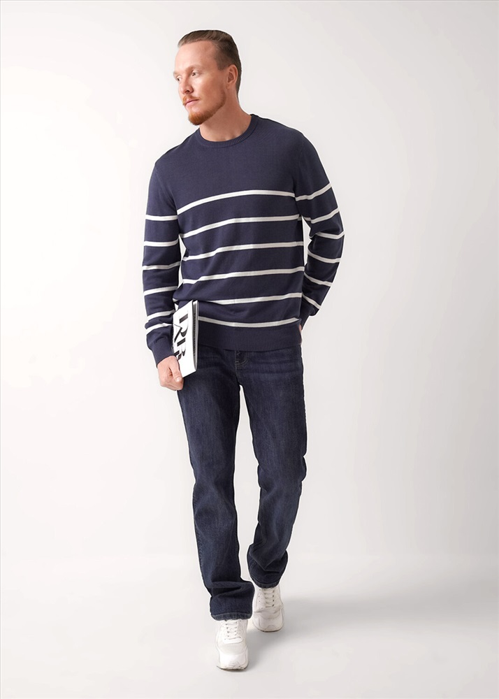 Джемпер мужской в полоску из смесовой хлопковой пряжи с длинным рукавом и круглой горловиной. Прекрасно сохраняет тепло, комфортный в носке, отличное решение на холодное время года. Комбинируется с джинсами или брюками.