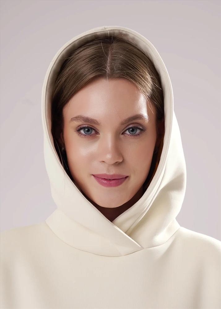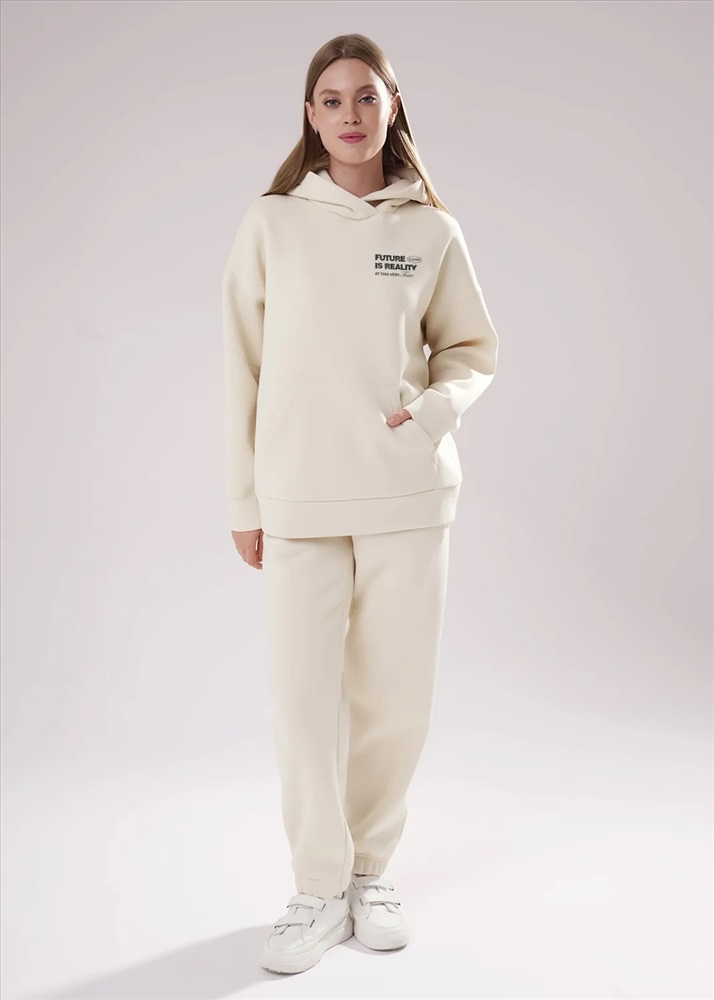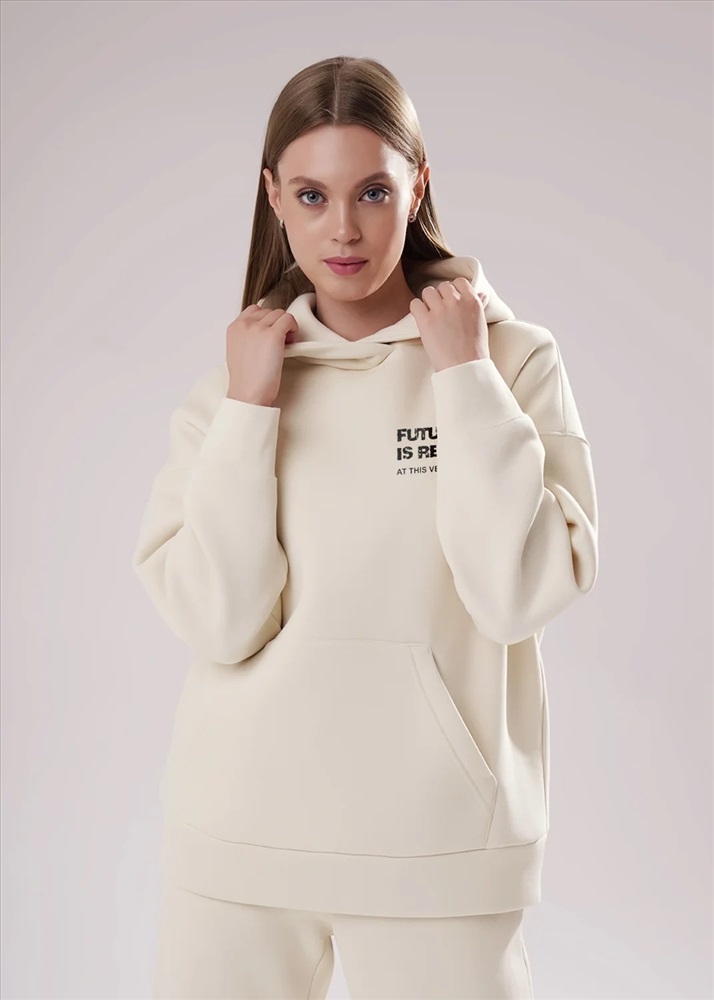 Джемпер спортивный свободного силуэта из трикотажного полотна футер с начесом, с капюшоном на подкладе. Длинный рукав со спущенной линией плеча. По низу рукава и изделия манжеты. Спереди вверху принт, внизу карман кенгуру.