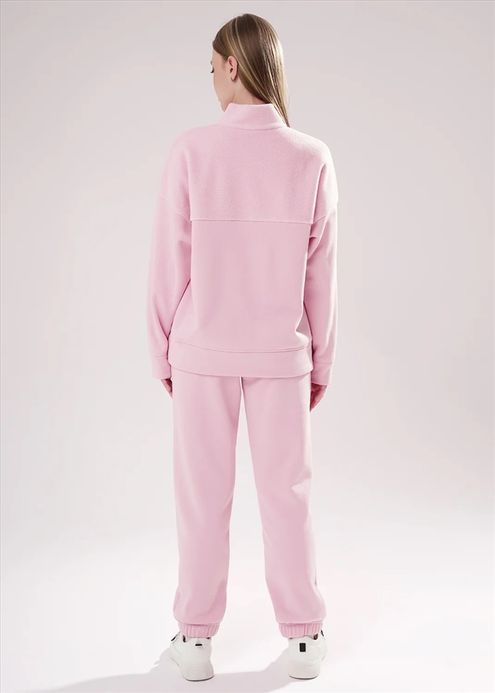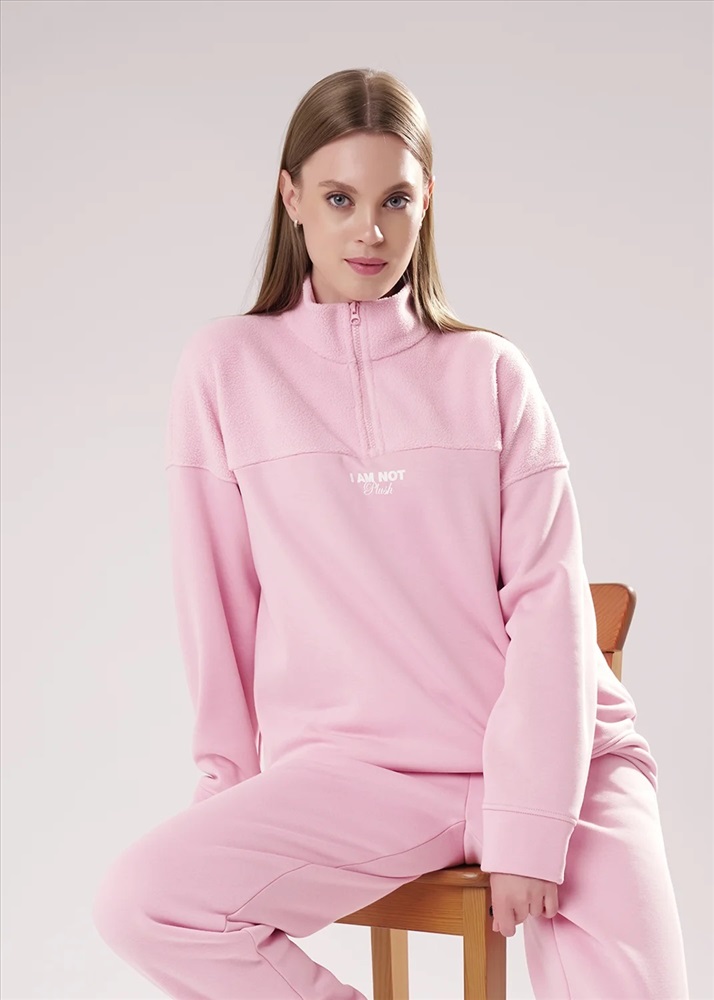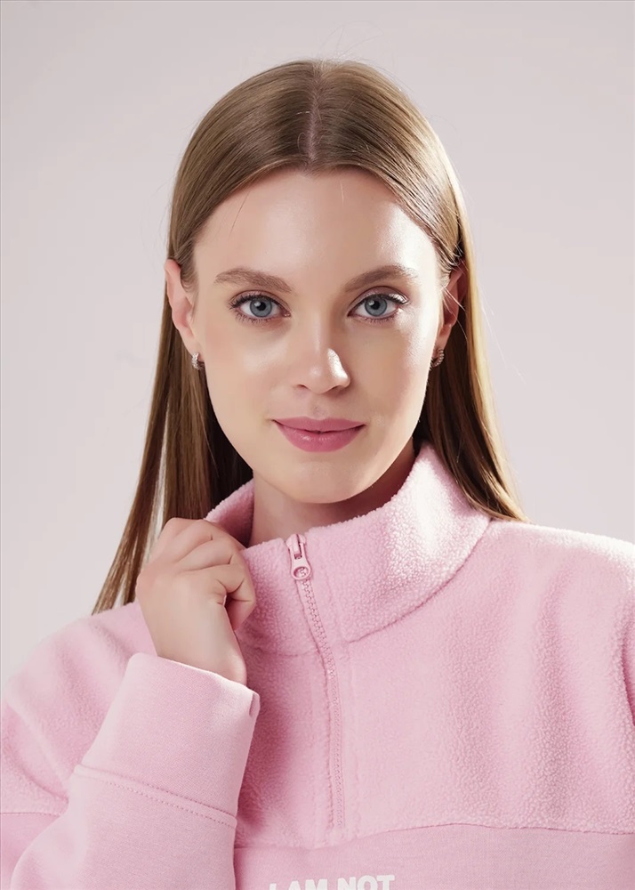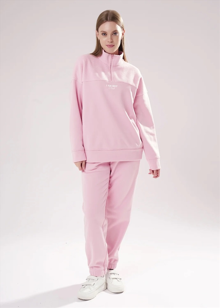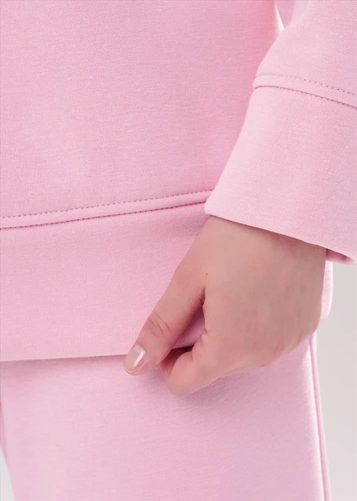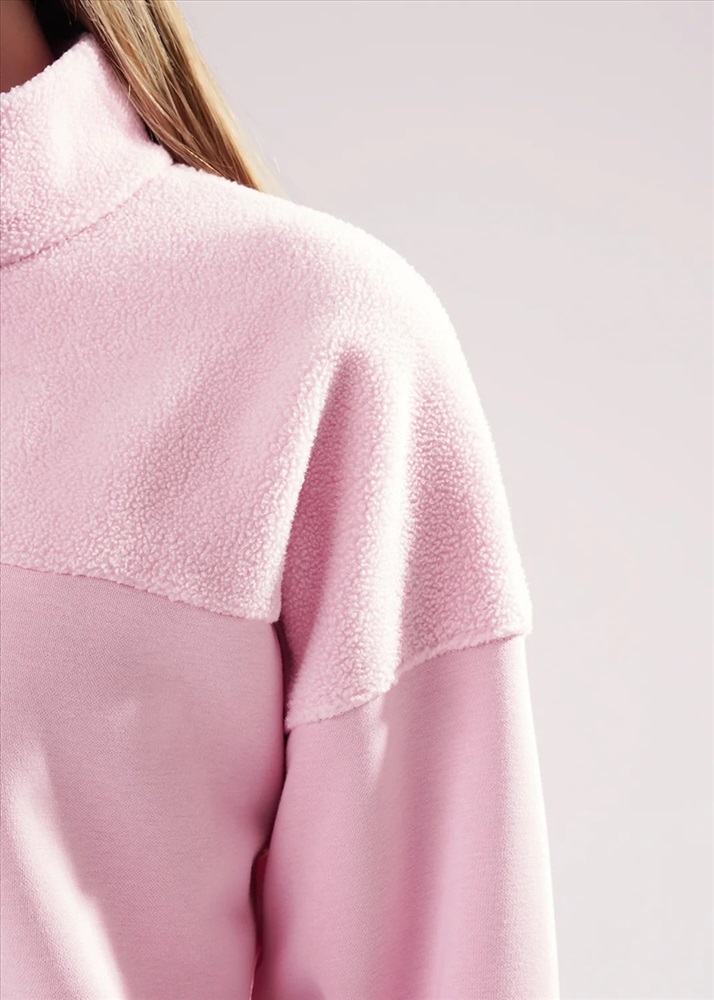 Джемпер спортивный свободного силуэта из трикотажного полотна футер с начесом "тедди". По горловине стойка с молнией. Спереди и по спинке кокетка наизнанку. Длинный рукав со спущенной линией плеча, по низу манжет. Внизу изделия притачной пояс.
