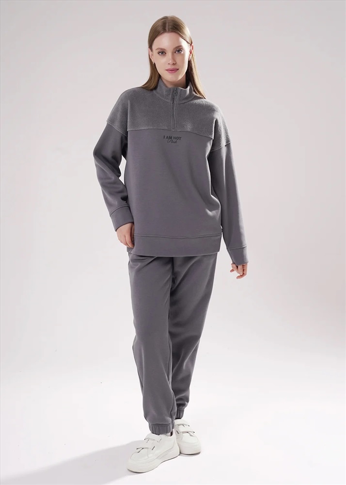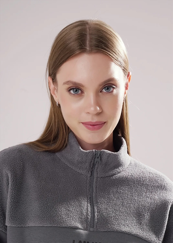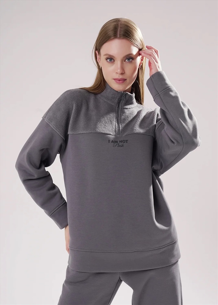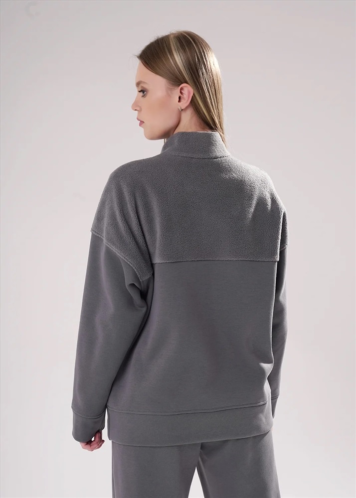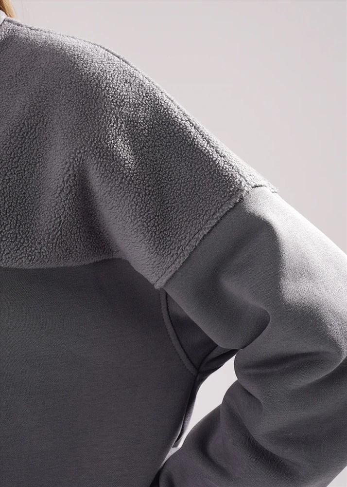 Джемпер спортивный свободного силуэта из трикотажного полотна футер с начесом "тедди". По горловине стойка с молнией. Спереди и по спинке кокетка наизнанку. Длинный рукав со спущенной линией плеча, по низу манжет. Внизу изделия притачной пояс.
