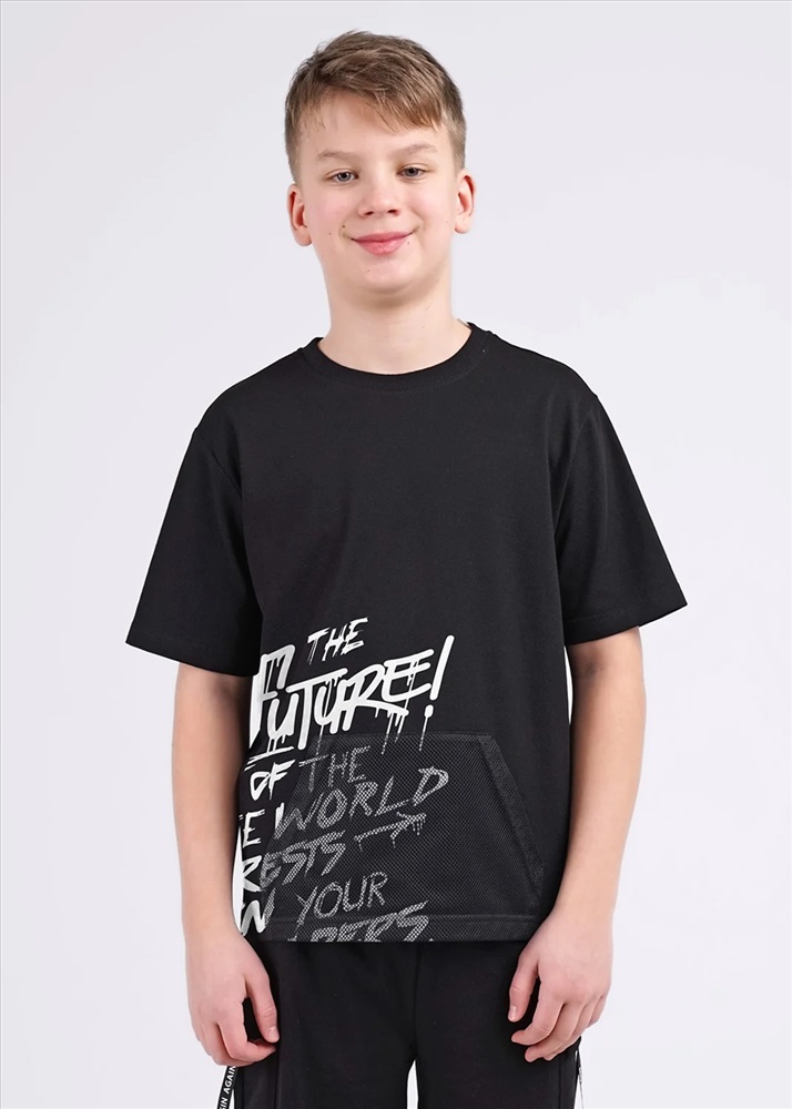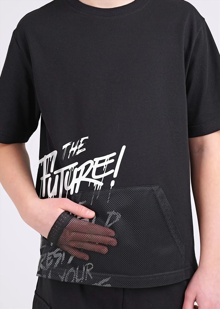 Черная футболка из мягкого пике с крупным принтом выразит твою индивидуальность! Ориганальная деталь - карман кенгуру из сетки. Умеренный объем, прямой силуэт, эластичная горловина из кашкорсе. Дополни модель шортами и крутой летний аутфит готов!