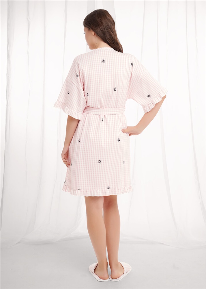 Халат из трикотажного полотна свободного кроя, на запах. По талии пояс со шлевками и внутренними завязками. По горловине и борту окантовка. Спущенная линия плеча, с коротким рукавом. По бокам накладные карманы. По низу рукава и изделия -рюша.