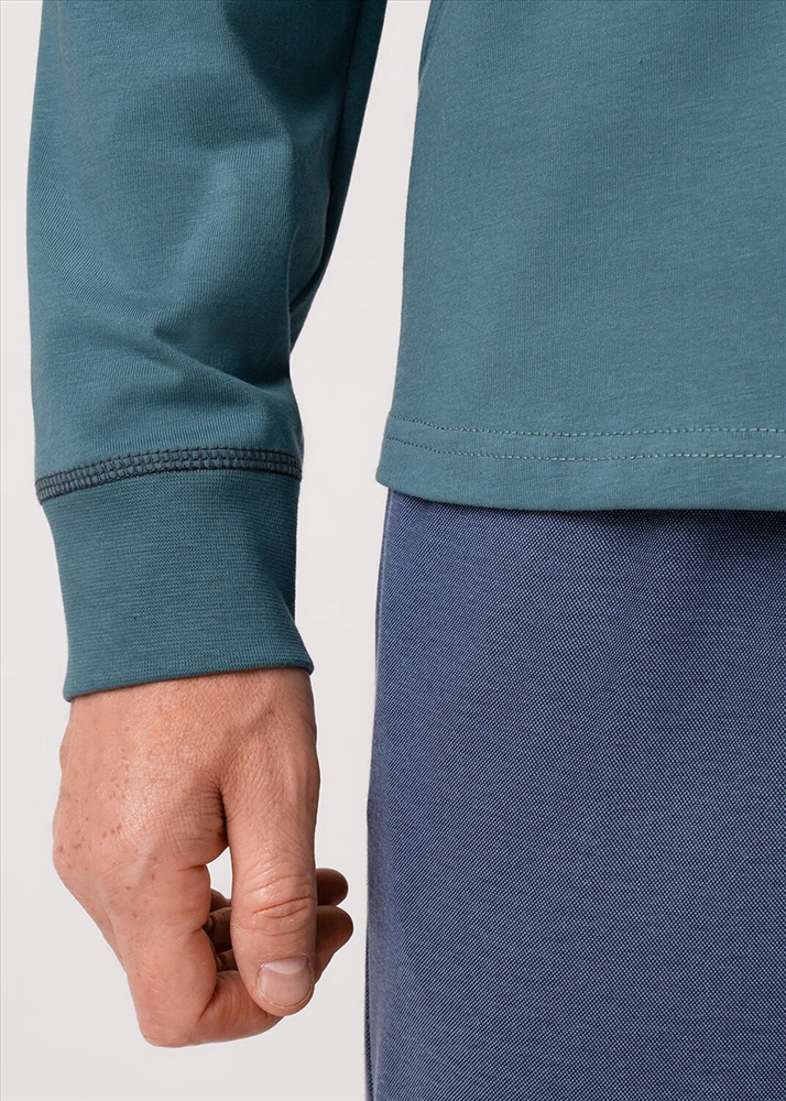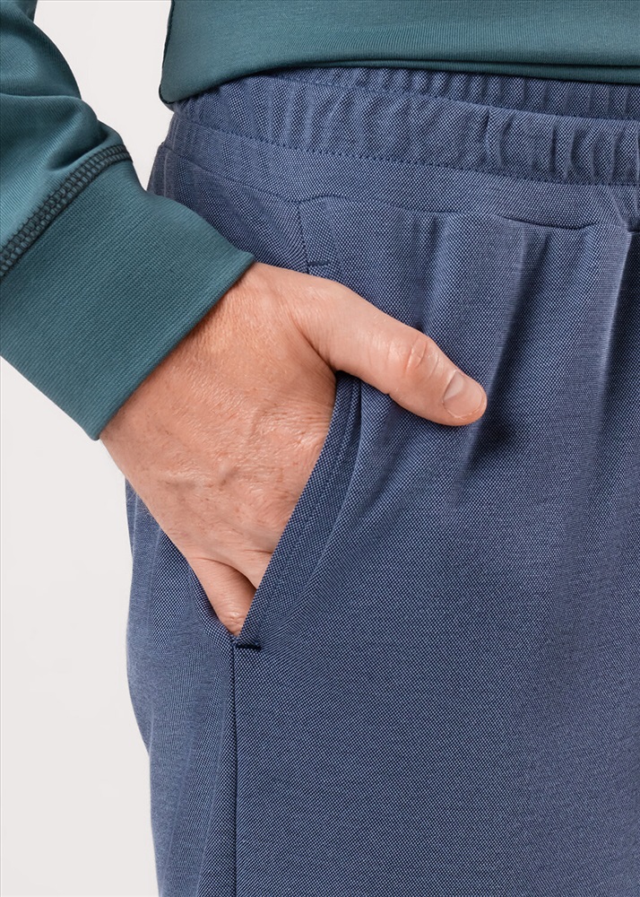 Набор мужской состоящий из джемпера и брюк. Джемпер из хлопковой кулирной глади с круглым вырезом горловины с принтом и декоративными застилами. Брюки из фактурного полотна - "пике" на широком поясе с резинкой и регулируемым шнуром, по бокам карманы.