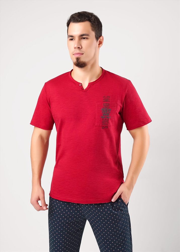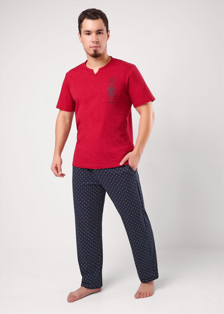 Набор, состоящий из футболки и брюк. Футболка из хлопкового фактурного полотна - флам, с коротким рукавом, V-образной горловиной, карманом с принтом. Брюки из хлопкового полотна в набивку на широком поясе с резинкой и шнуром, по бокам удобные карманы.
