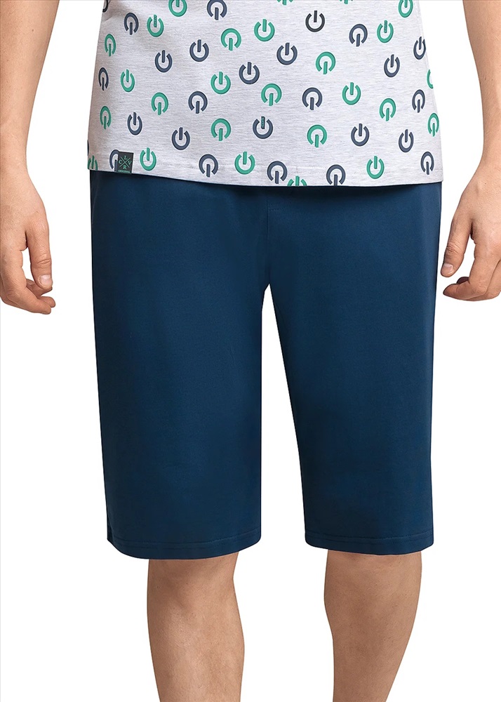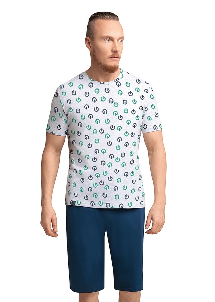 Комплект мужской для дома, состоящий из футболки и шорт. Футболка из трикотажного полотна с круглым вырезом горловины, коротким рукавом. Шорты из плотного трикотажа на эластичном поясе с функциональными карманами и шнуром.
