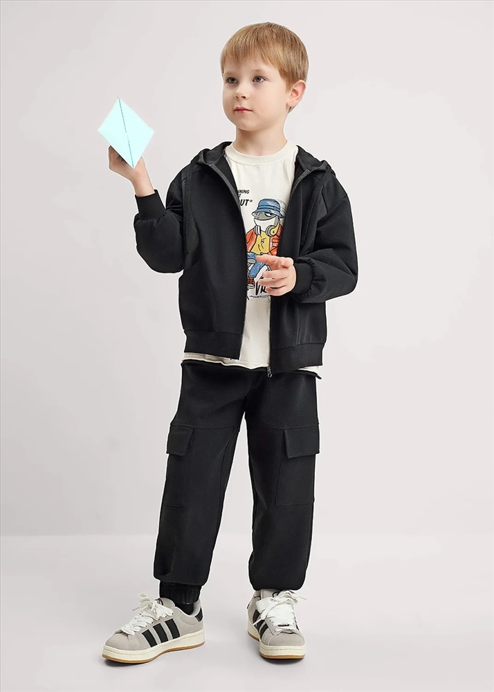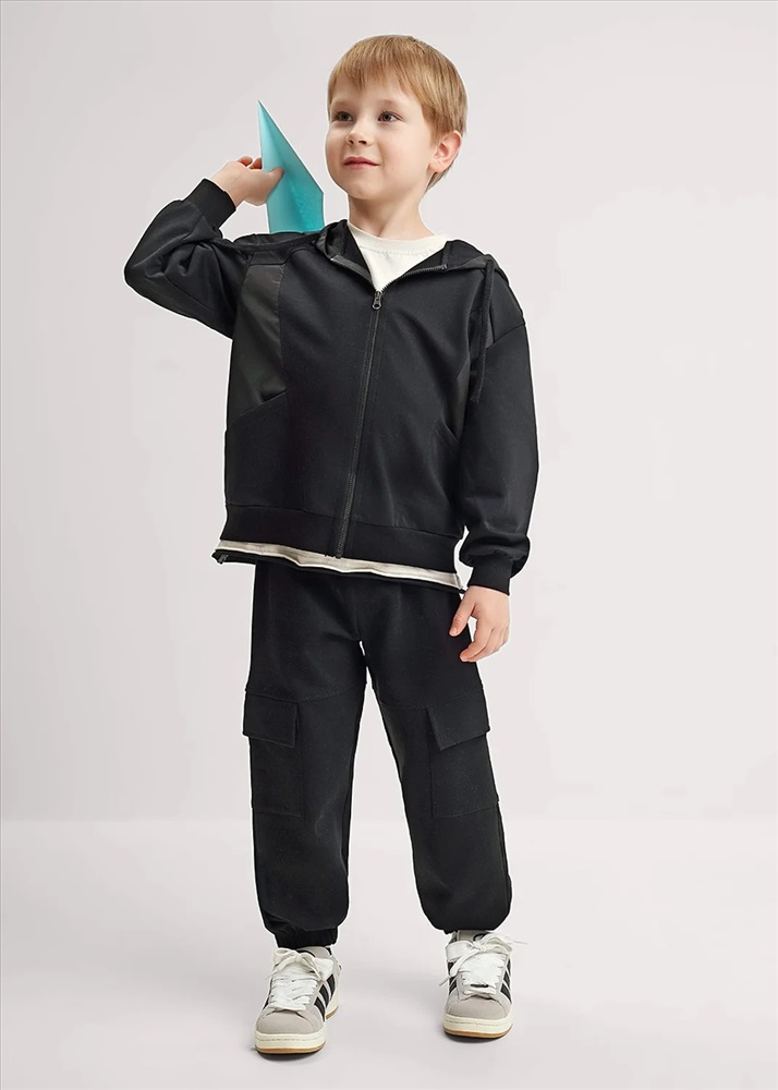 Удобная черная толстовка для мальчика с молнией, капюшон и боковые части из ветрозащитной плащевой ткани. Капюшон регулируется шнурком, есть вместительные карманы. Эластичные манжеты обеспечивают комфортную посадку по фигуре.