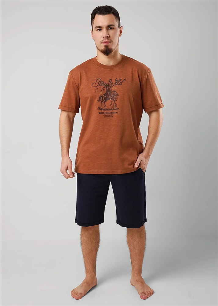 Производитель: CLEVER; Российский размер: 48; Рост: 176; Обхват груди: 96; Обхват талии: 84-86; Обхват шеи: 40; Артикул поставщика: MHP560712/1; Состав: 100%Хлопок; Сезон: Весна, Лето; Год: 2026; Страна: Россия Набор мужской состоящий из футболки и шорт. Футболка из полотна "флам" с коротким рукавом, округлым вырезом горловины и дизайнерским принтом. Шорты из фактурного полотна - "пике" с декоративным гульфиком на эластичном поясе, по бокам удобные карманы.