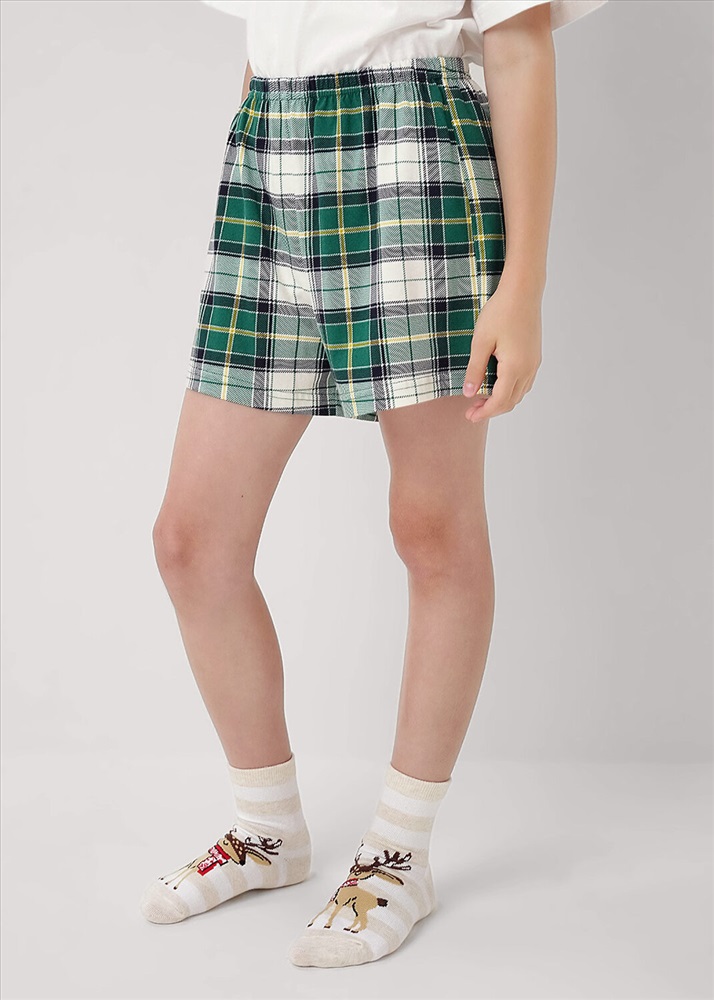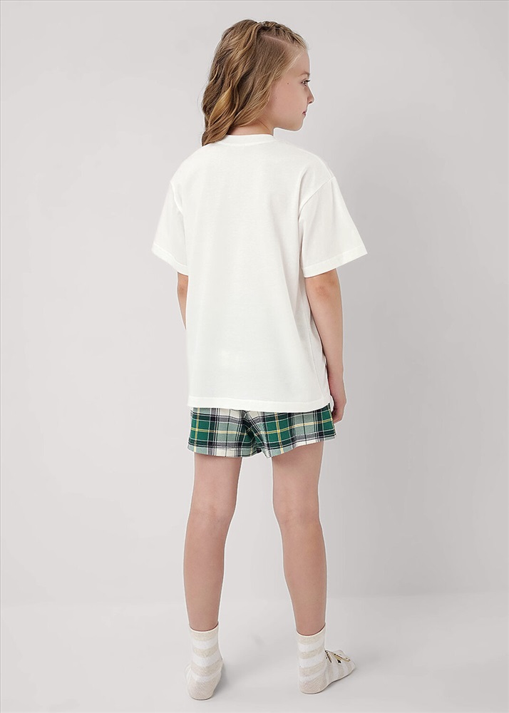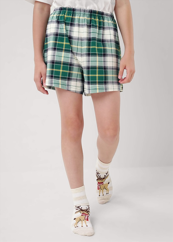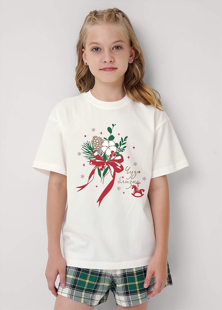 Новогодняя хлопковая пижама,состоящая из футболки и шорт. Футболка свободного кроя спереди украшена милым тематическим принтом. Шорты с высокой талией, эластичный пояс обеспечит комфорт и идеальную посадку.