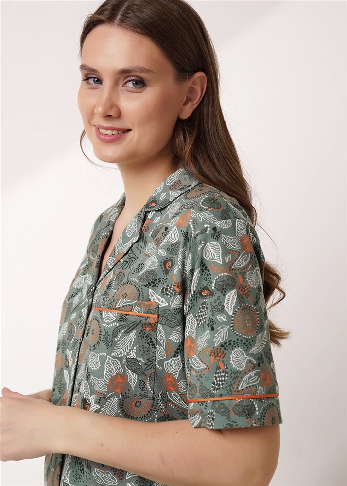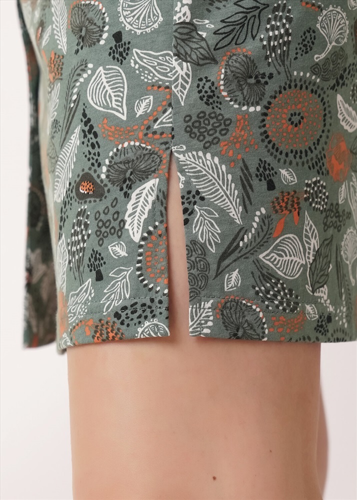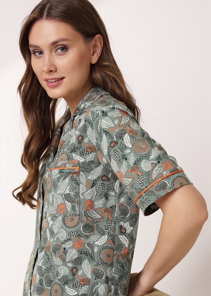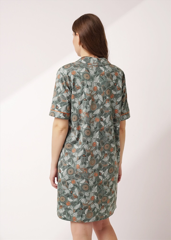 Платье для дома и отдыха прямого силуэта из хлопкового трикотажного полотна. Застёжка на пуговицы, отложной воротник с лацканами. Втачной короткий рукав, внизу с контрастным кантом. Спереди накладной карман с контрастным кантом. Боковые разрезы.