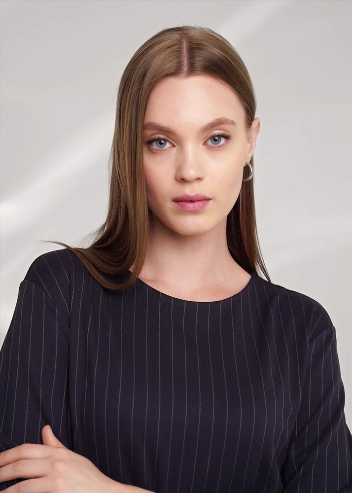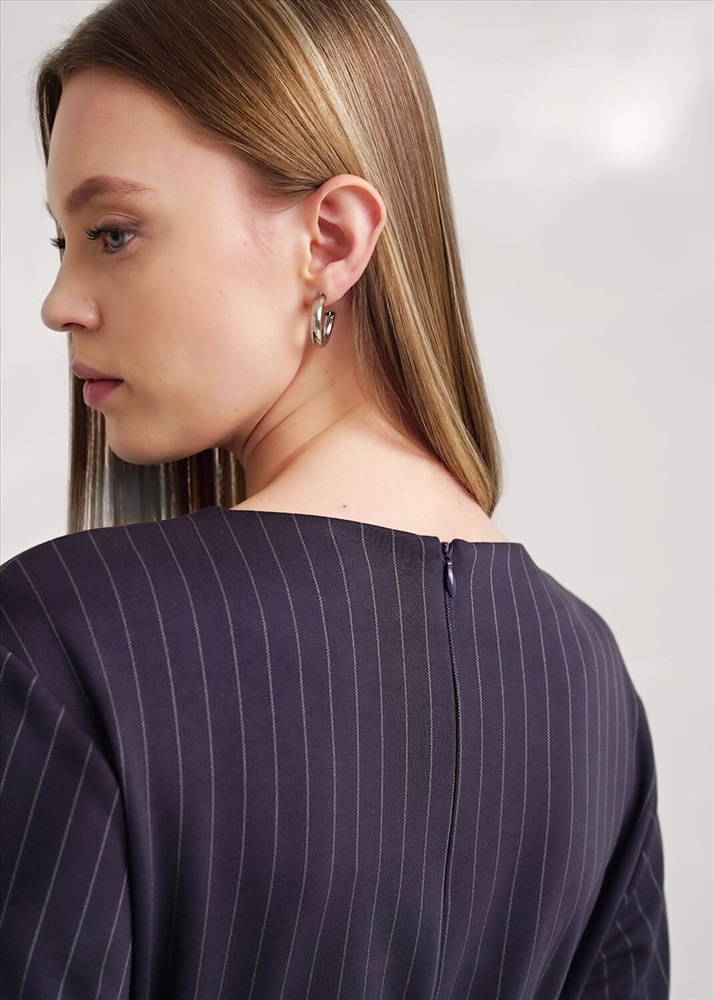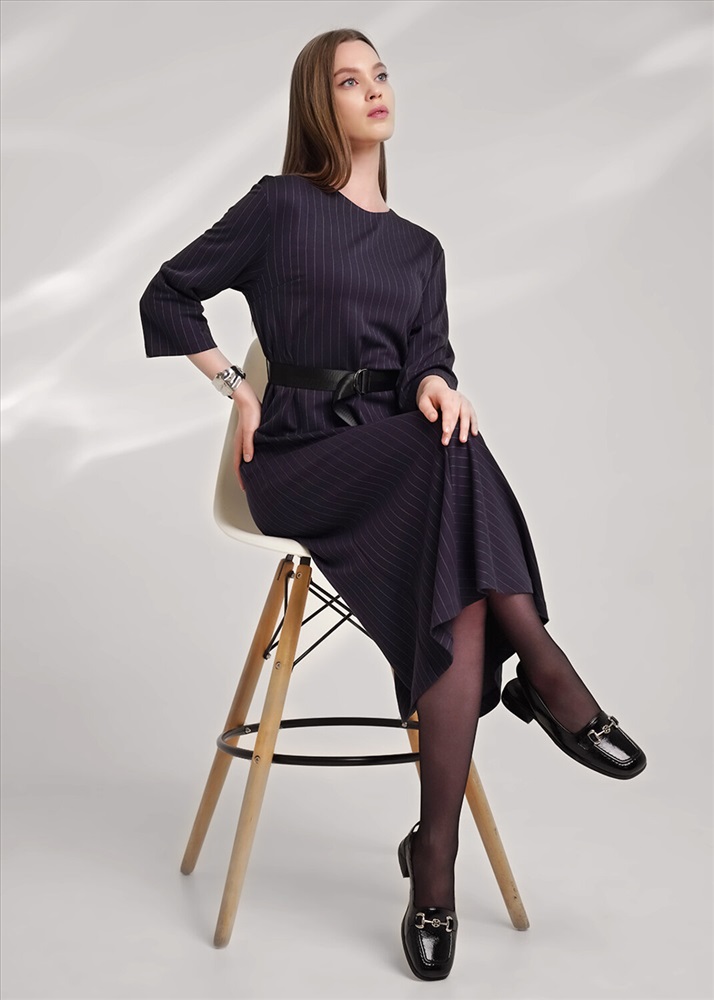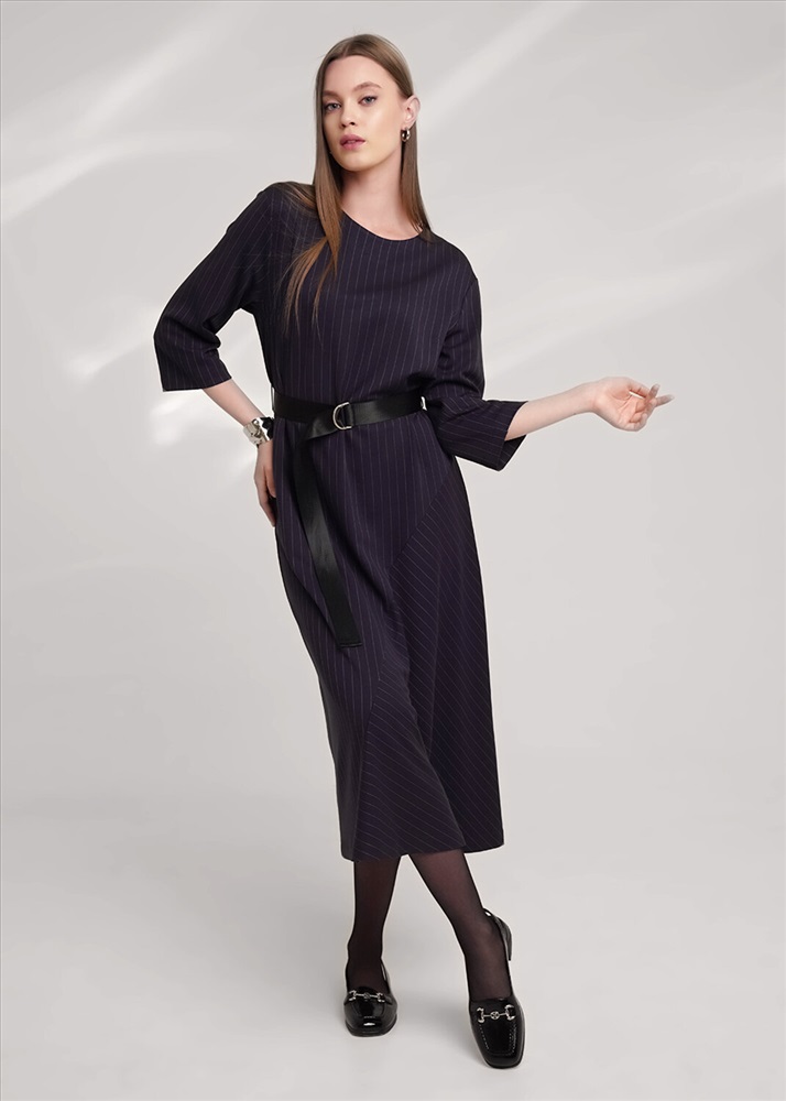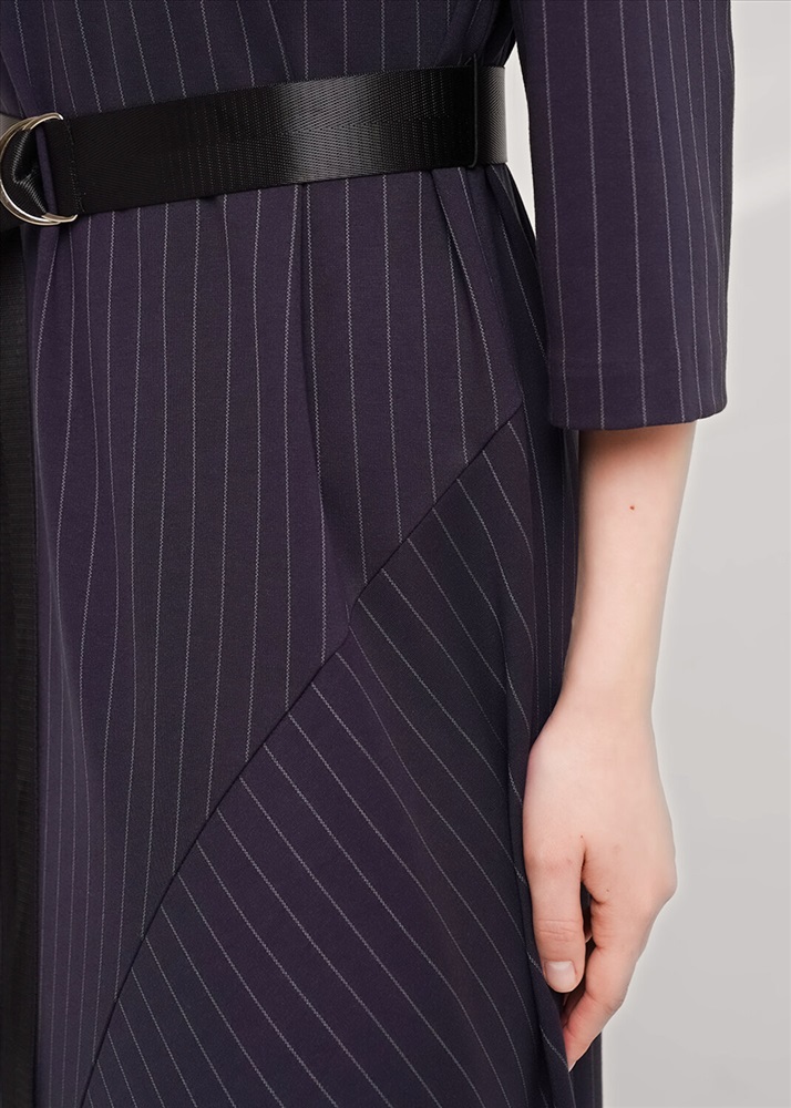 Платье из поливискозного трикотажного полотна джерси, длиной миди.Округлая горловина с внутренней обтачкой. Втачной рукав 7/8. Спереди вставка - полотно полоса по диагонали. По спинке средний шов с потайной молнией. Съёмный пояс из стропы с полукольцами.