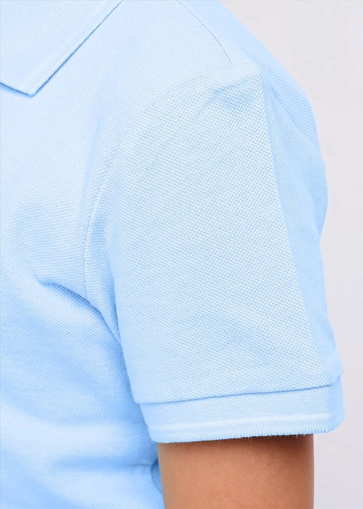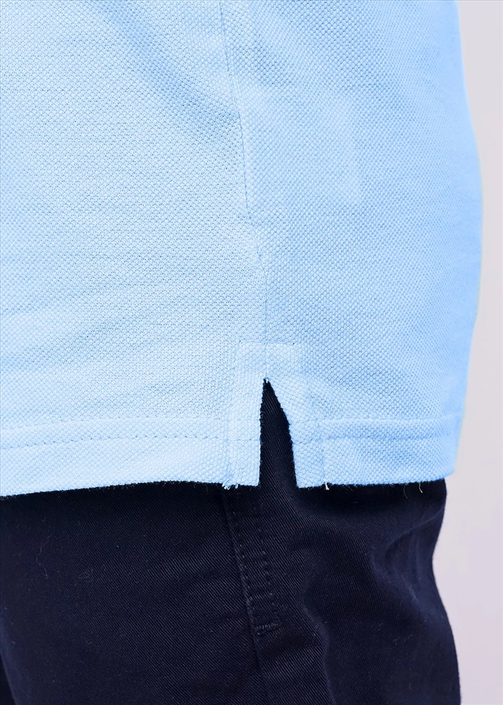 Базовое поло на пике. По краю воротника и манжет отделочная полоска. Застежка на пуговицы с логотипом. Сбоку невысокие разрезы. Украшена модель брендированной вышивкой.
