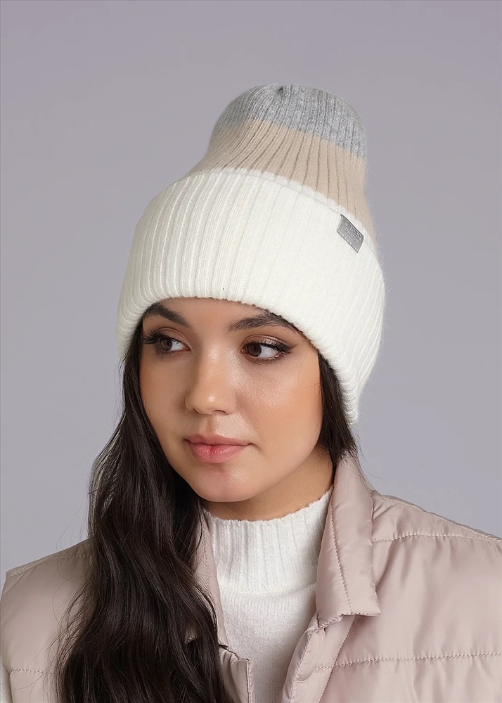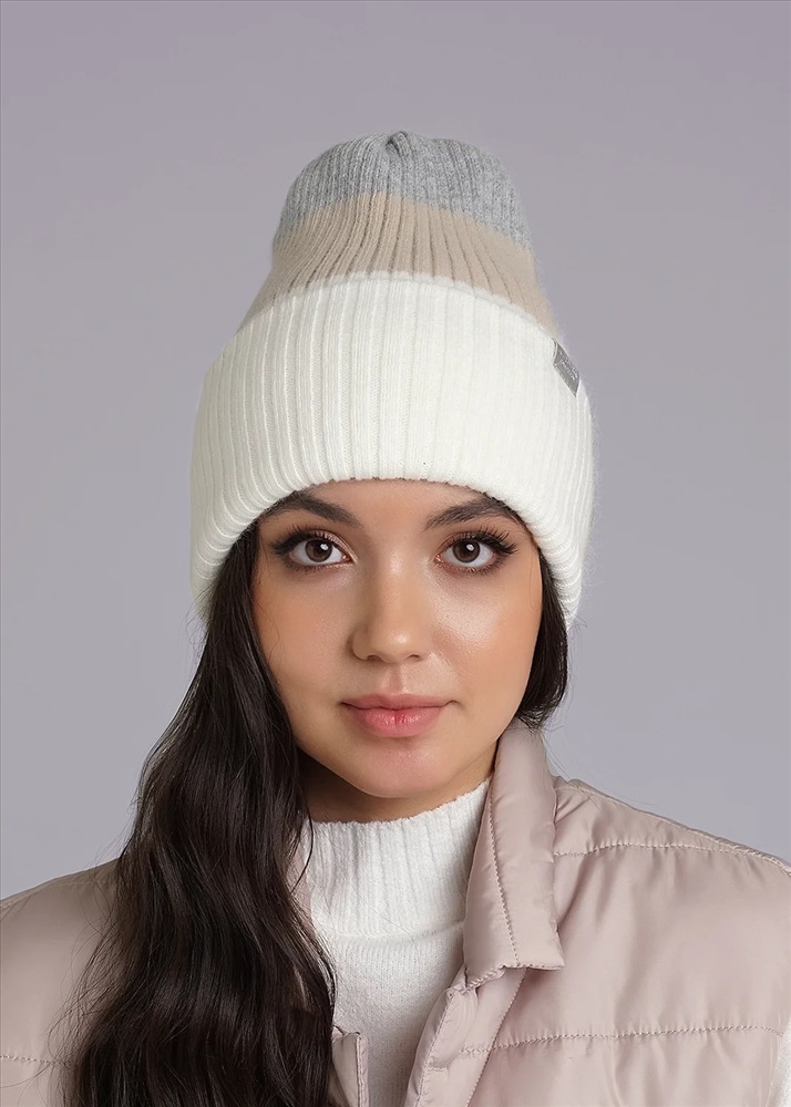 Женская двойная шапка с отворотом , декорирована нашивкой логотип в височной зоне. Подойдёт для холодной зимы.