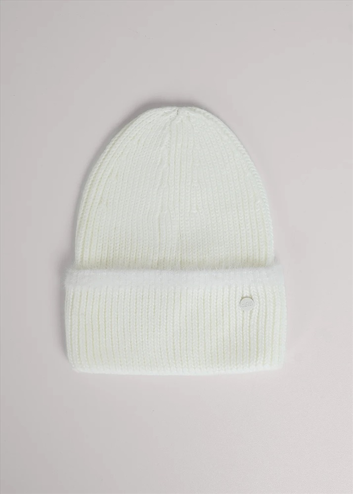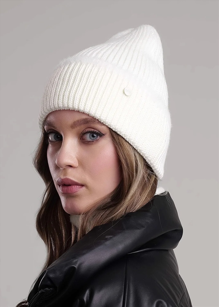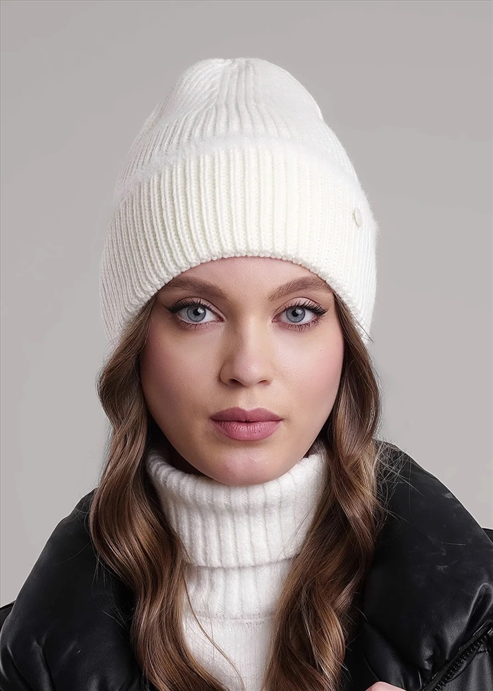 Шапка женская однослойная с отворотом, без подклада. Выполнена из высококачественной пряжи, декорирована стильной нашивкой в височной зоне. Станет не только отличной защитой от холода, но и модным аксессуаром.