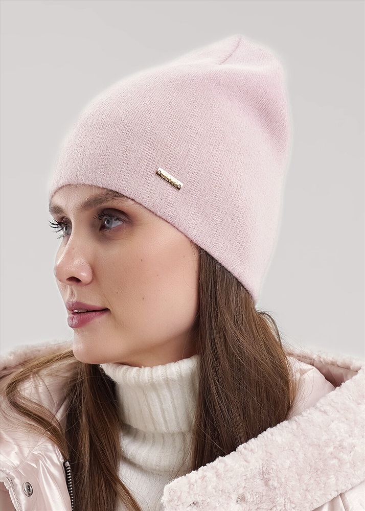 Шапка женская двойная без отворота с пряжей ангора, без подклада, декорирована стильной нашивкой в височной зоне. Станет не только отличной защитой от холода, но и модным аксессуаром.
