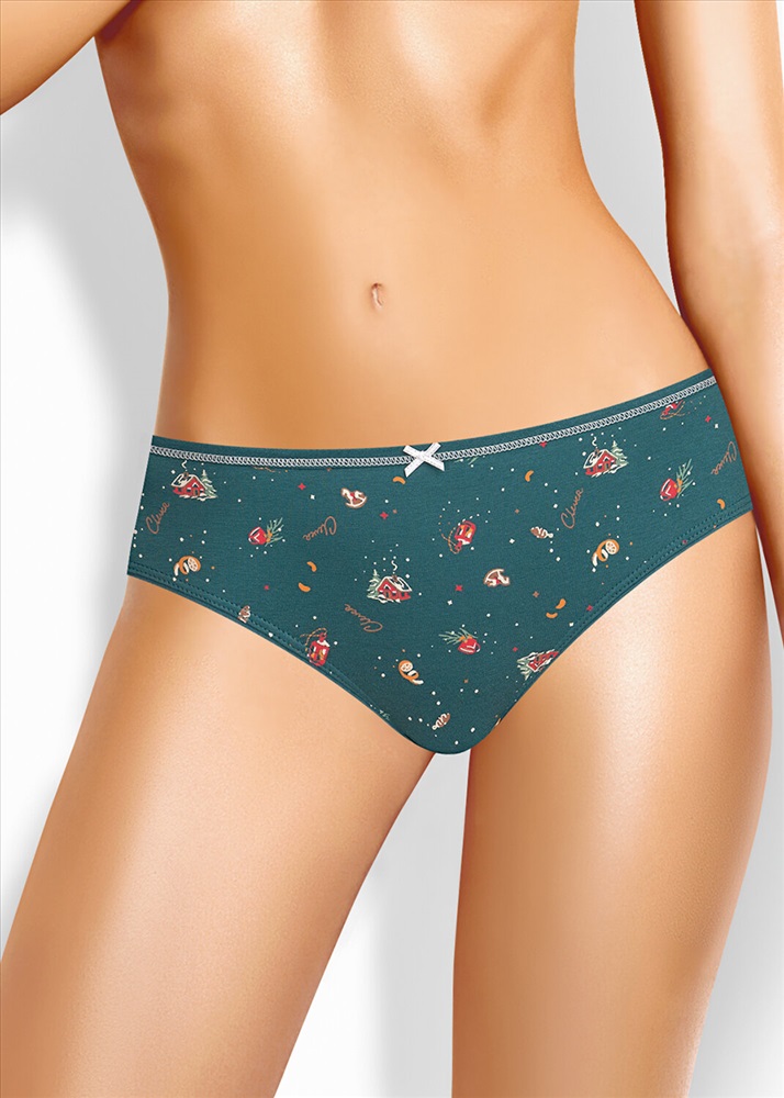 Трусы бикини женские из эластичного хлопкового полотна. Обработка краев по талии - окантовочная резинка с застилом, по ноге - полуокантовка. По переду атласный бант.