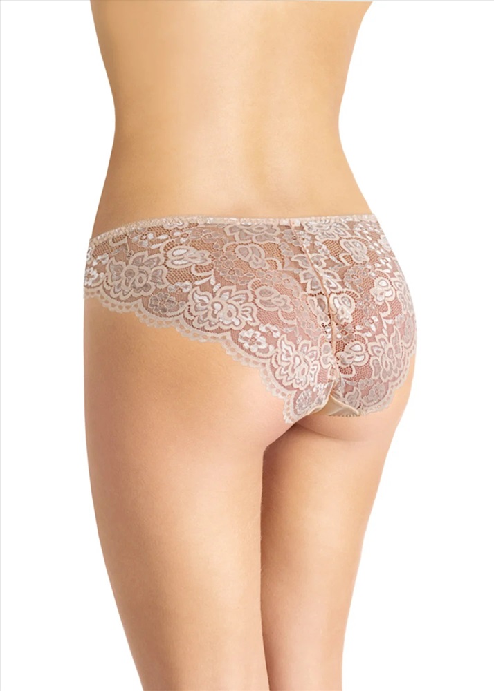 Бикини с кружевной вставкой по верху переда и кружевной спинкой со средним швом. По поясу и ножке со стороны переда обработка резинкой с фестоном. На детали переда - небольшой атласный бант.