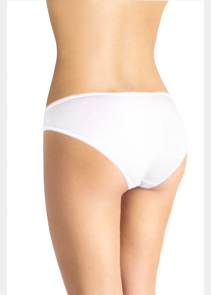 Трусы бикини женские из эластичного хлопкового полотна. Обработка краев - ажурная резинка с фестоном. Спереди бант и вставки из кружева.