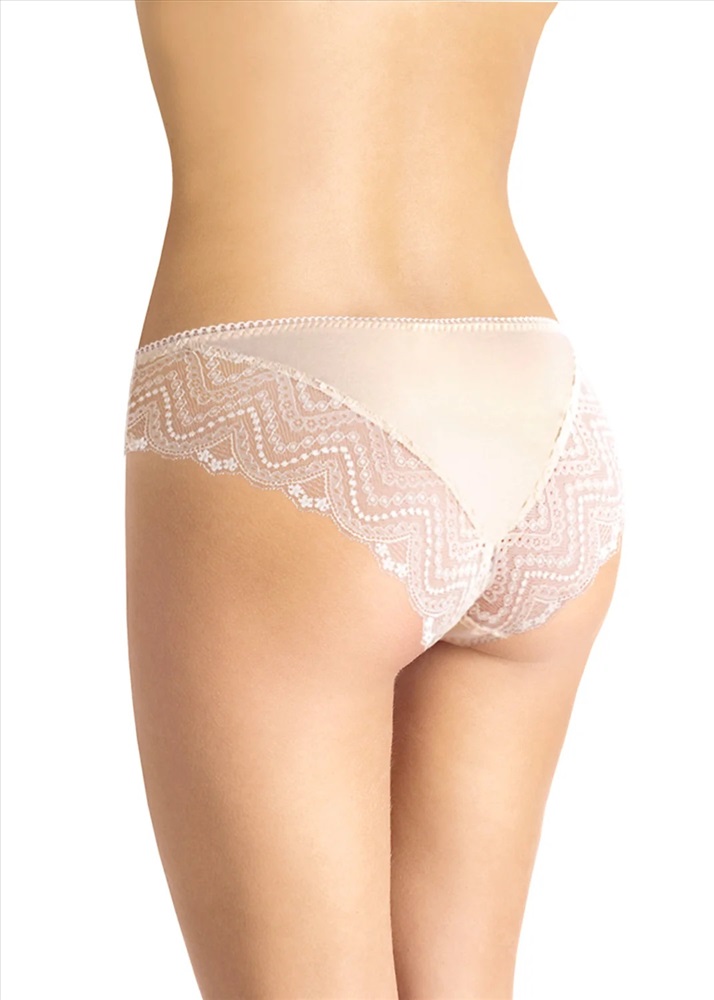 Бикини на хлопке. Модель имеет симметричные кружевные вставки и бант на детали переда и кружевную спинку с треугольной вставкой из (г). По ножке и поясу выполнена обработка резинкой с фестоном.