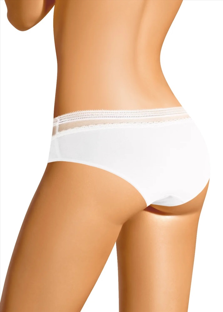 Трусы-бикини женские из эластичного хлопкового полотна. Спереди вставка из сетки с узким кружевом. Обработка краев по талии - сеткой с ажурной широкой резинкой, по ноге - узкой окантовкой.