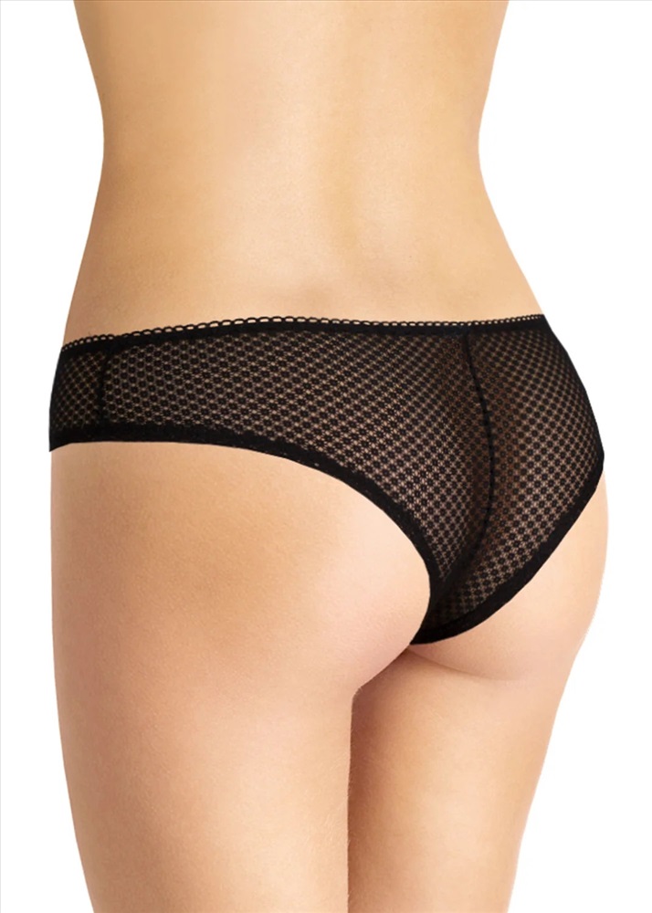 Бразилиано. Комбинированная модель: перед - однотонное хлопковое полотно, спинка и отрезной бочок - кружево. По талии - резинка с фестоном. В центре на детали переда расположен небольшой атласный бант. Декорированы симметричными элементами из кружевной тесьмы,расположенными по линии реза