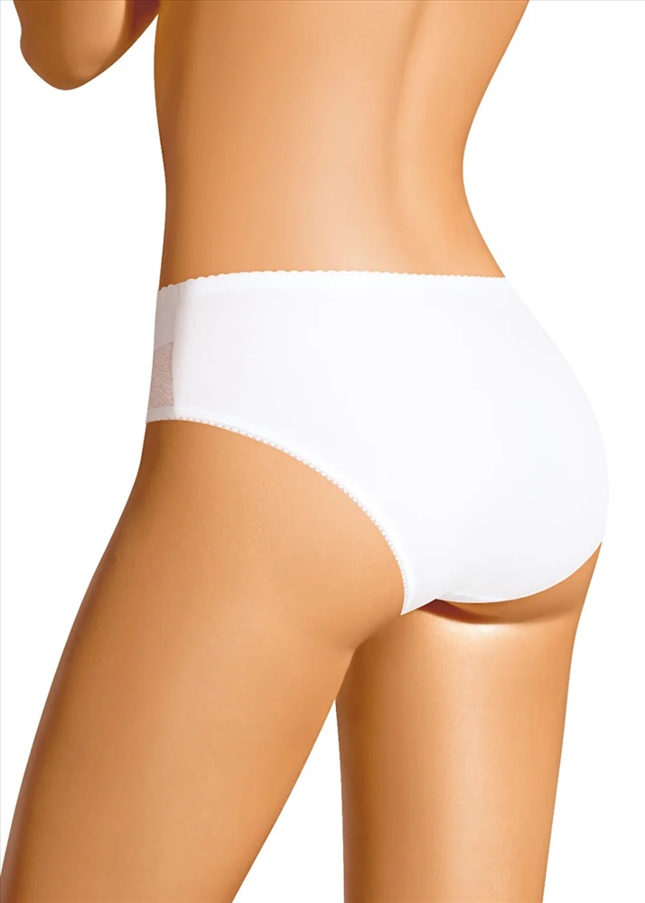 Трусы слипы женские из эластичного хлопкового полотна. Обработка краев по талии и ноге ажурная резинка с застилом. По переду кружевное полотно, дублируется вставкой из хлопкового полотна, швы застилом, атласный бант.