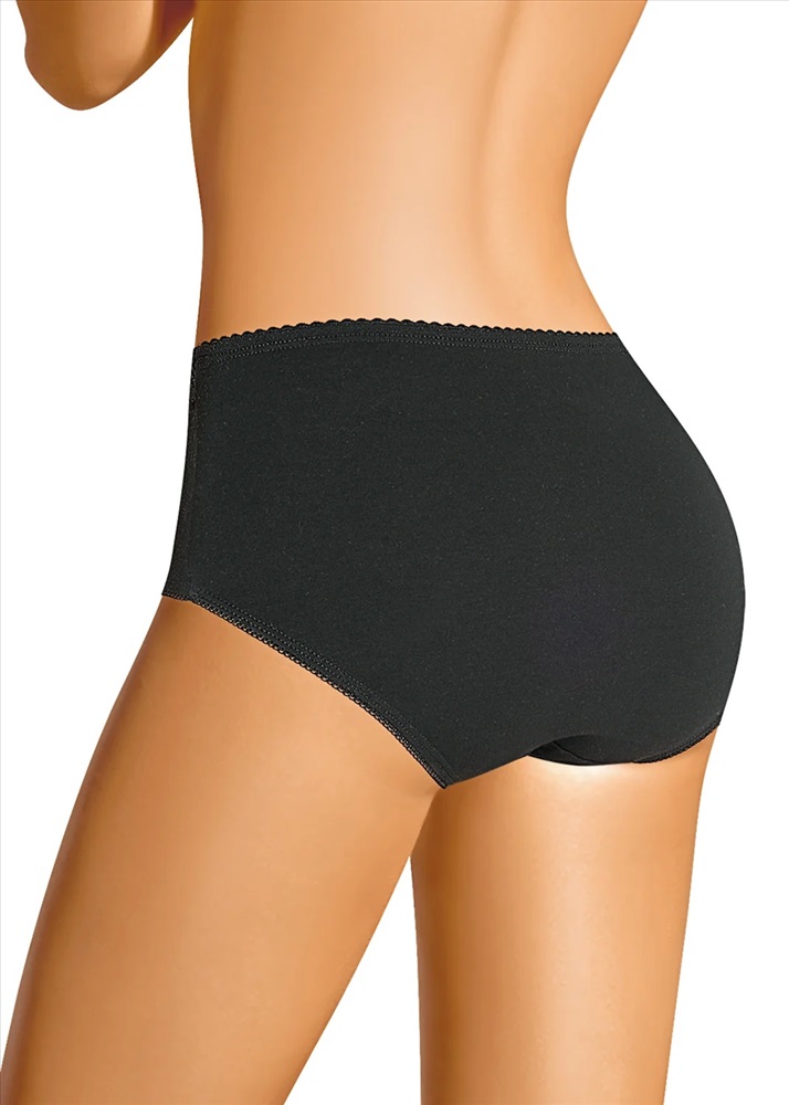 Трусы-макси женские из плотного эластичного хлопкового полотна. Обработка краев - ажурной резинкой с фестоном. По переду вставки из кружева и бант.