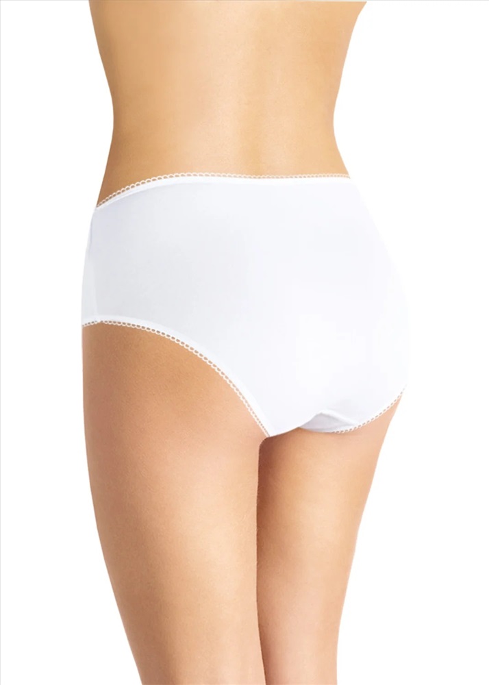 Трусы макси удобной посадки. По ножкам и по поясу выполнены фестоны. Передняя половина трусов с левого бока украшена кружевом в две полосы с небольшим атласным бантиком.