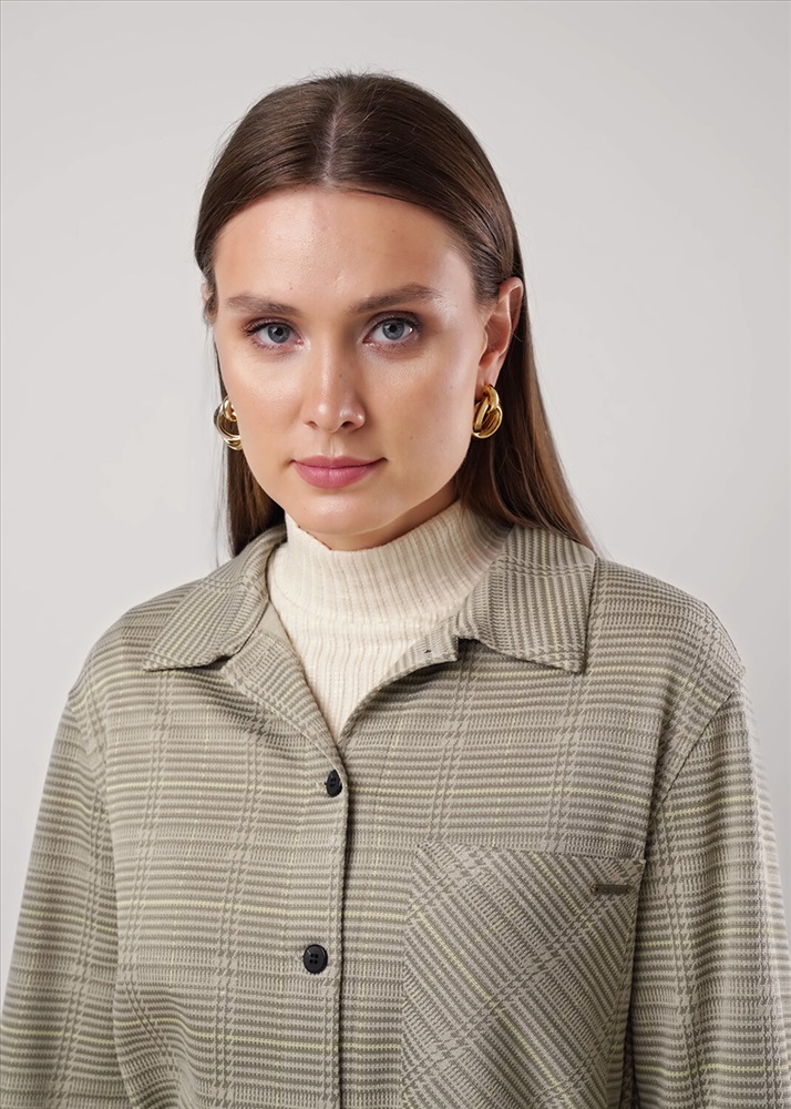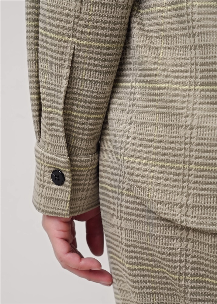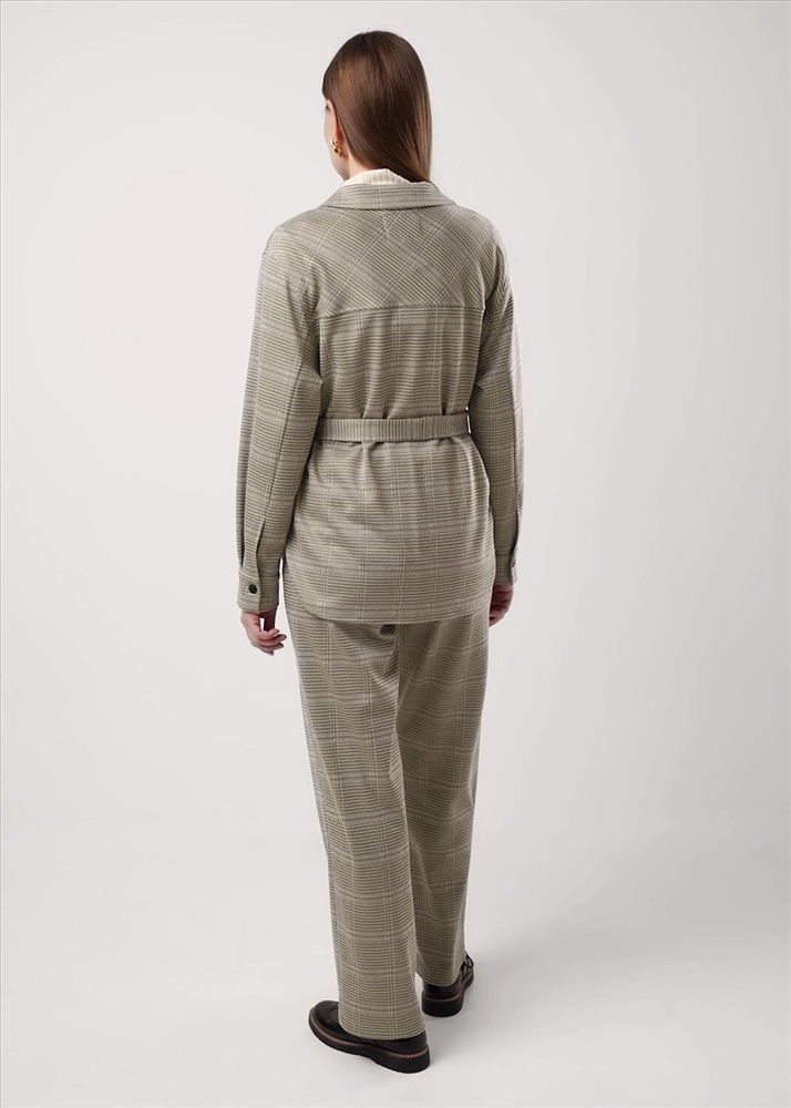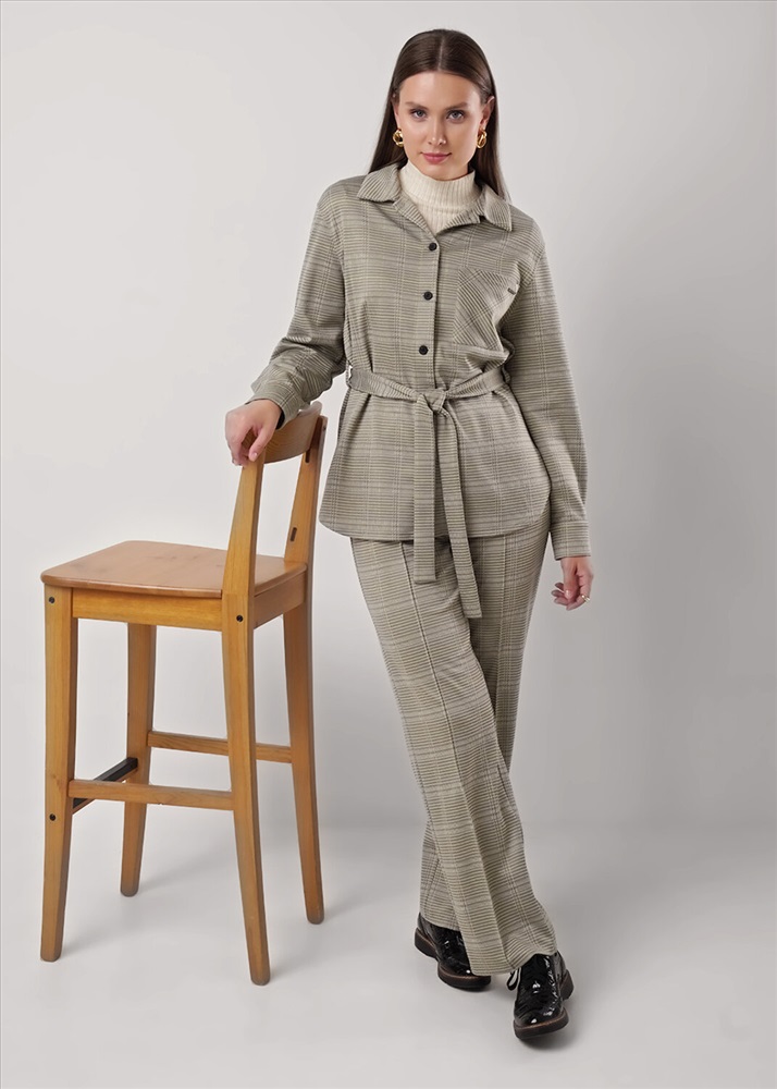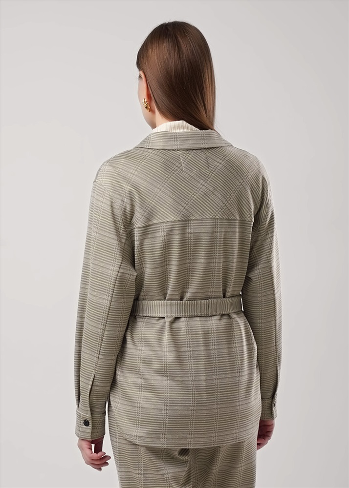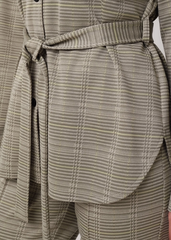 Жакет из трикотажного поливискозного полотна джерси,с застежкой на пуговицы.Отложной воротник.По талии съёмный пояс,шлевкаи. Втачной длинный рукав, внизу манжет на пуговице.Спереди накладной карман, нашивка металл.По спинке кокетка. Фигурный низ изделия.