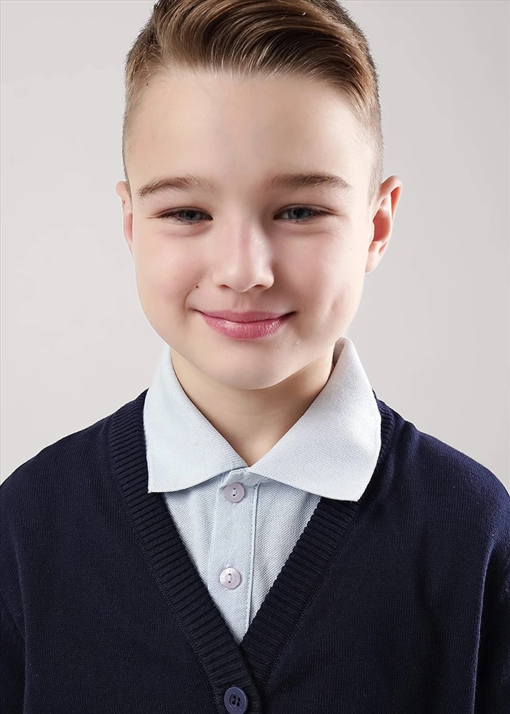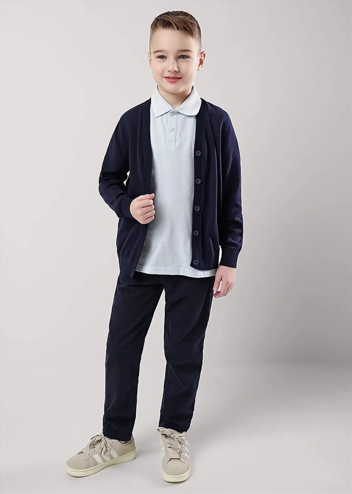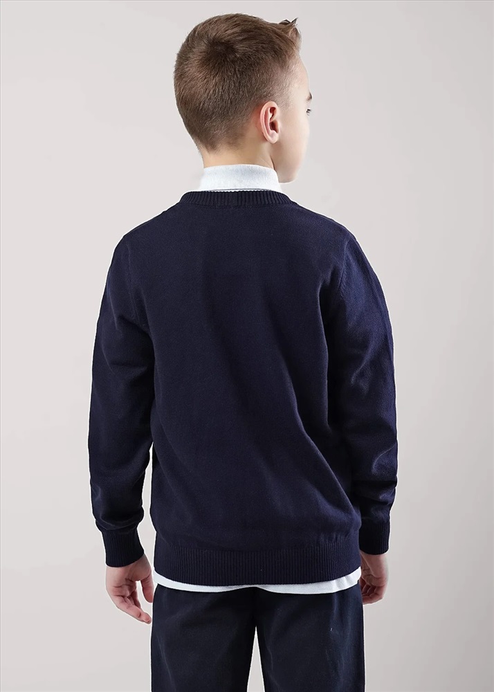 Базовый кардиган из хлопковой пряжи для мальчика. Застежка на пуговицы, по низу рукавов и изделия эластичная вязка.