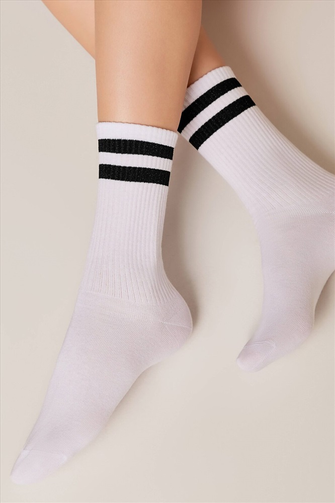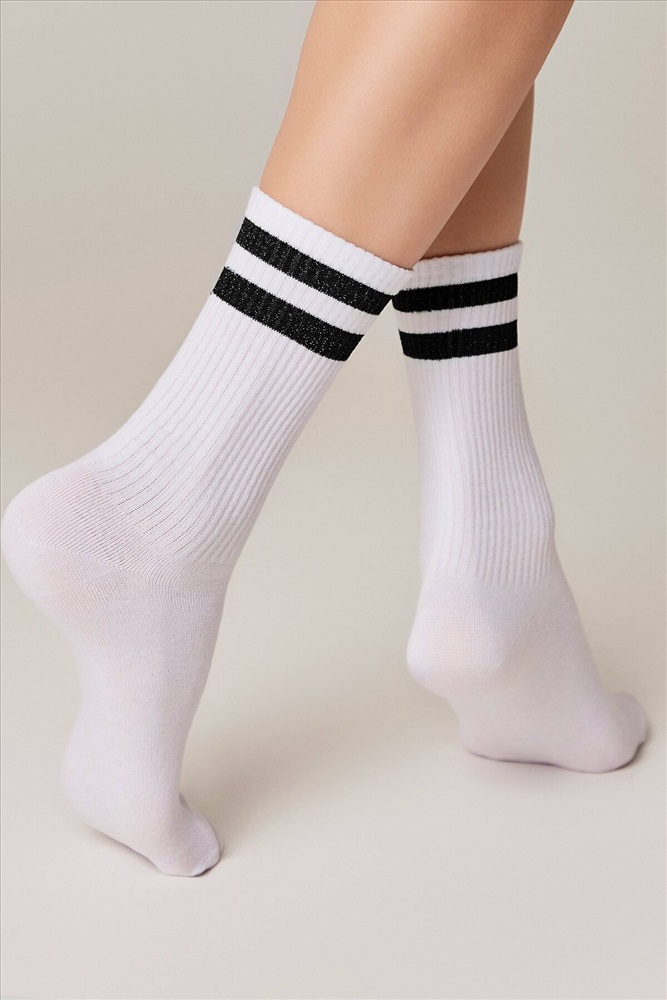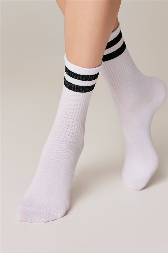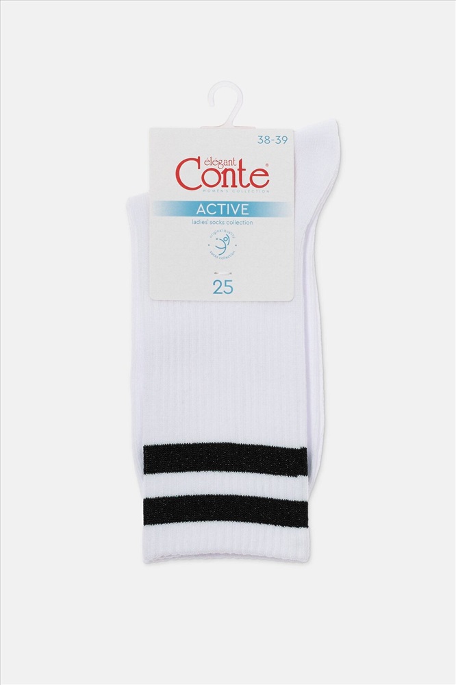 Хлопковые носки с яркими полосками из люрекса смотрятся так стильно и оригинально, что вам не захочется прятать их под одеждой. Смело носите трендовые носочки ACTIVE в стиле спорт-шик и с удовольствием подчеркивайте свою индивидуальность.
