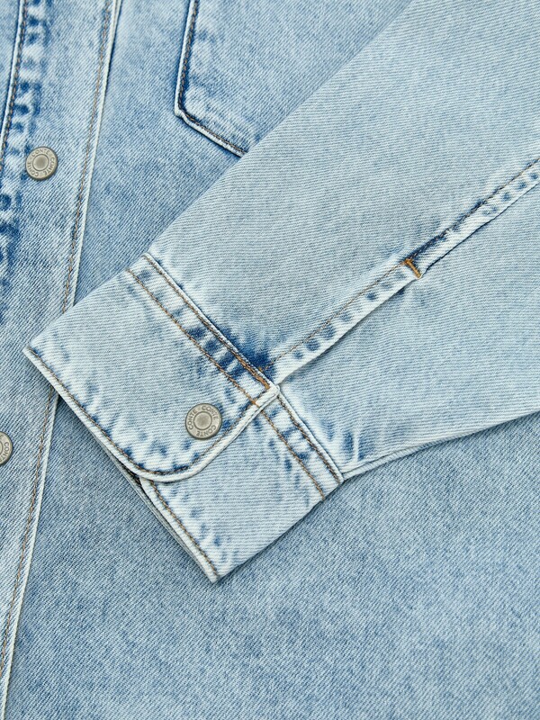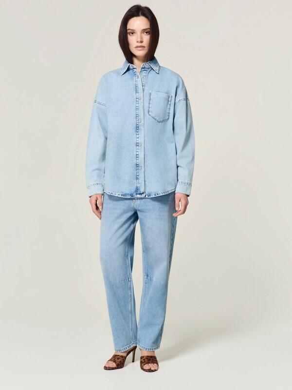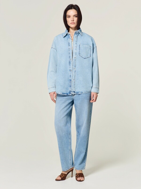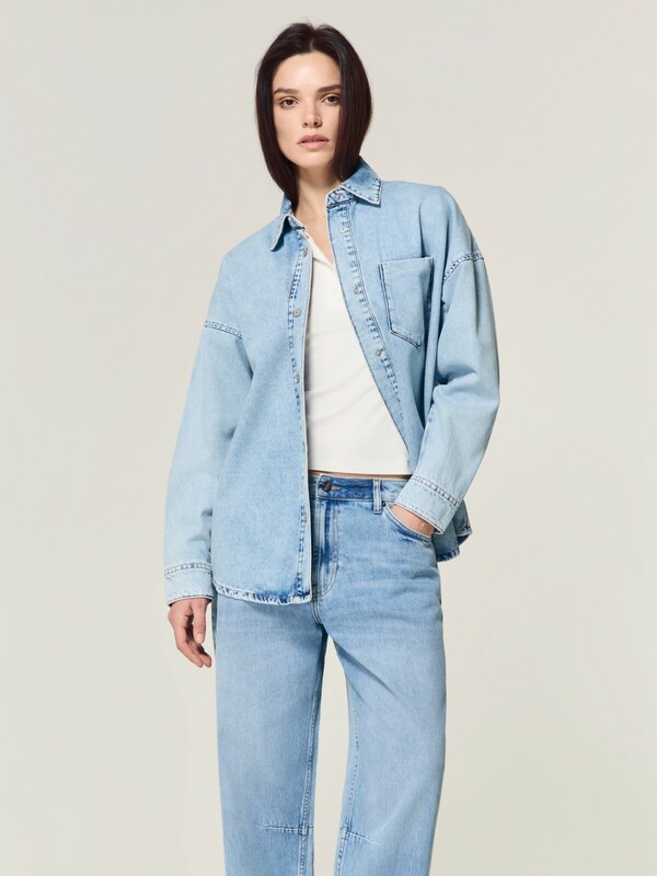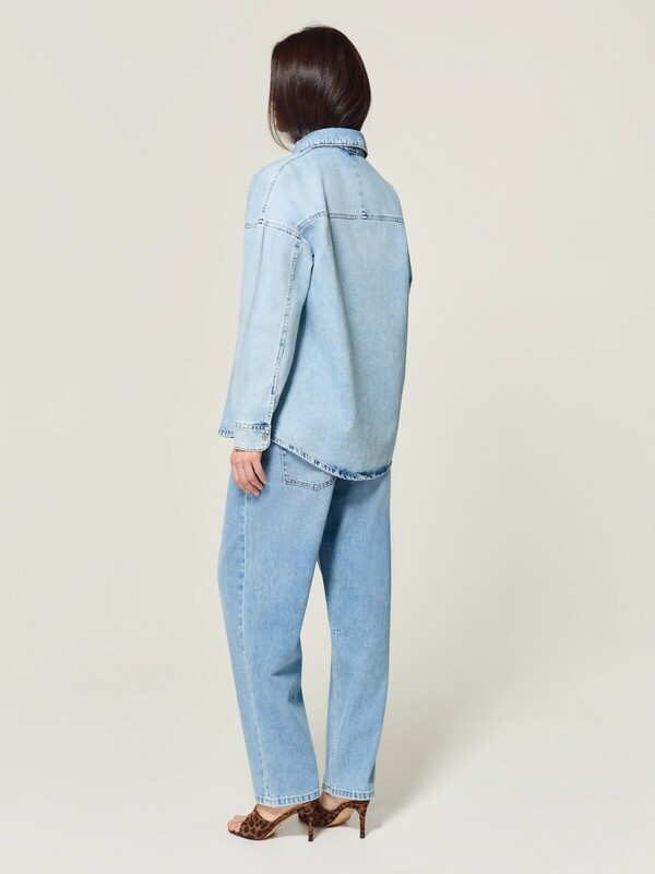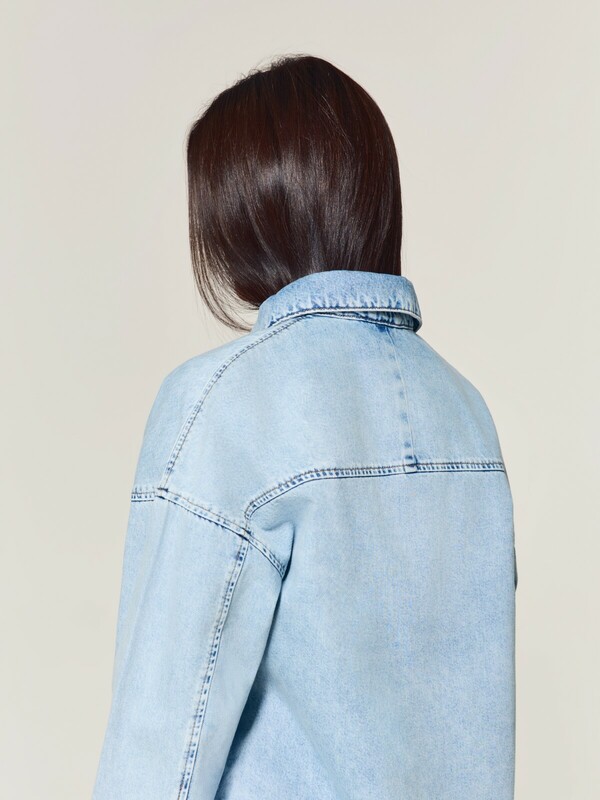 · oversize · классическая длина · плотный деним премиального качества · отложной воротник-стойка · спущенная линия плеч · двухшовные рукава с манжетами · накладной карман на груди · контрастная строчка · застежка на планку с кнопками · кокетка на спинке · металлическая фурнитура с патиной · петля для подвешивания изделия · сохранение формы и цвета при соблюдении рекомендаций по уходу. хлопок 100% Комментарии к товару