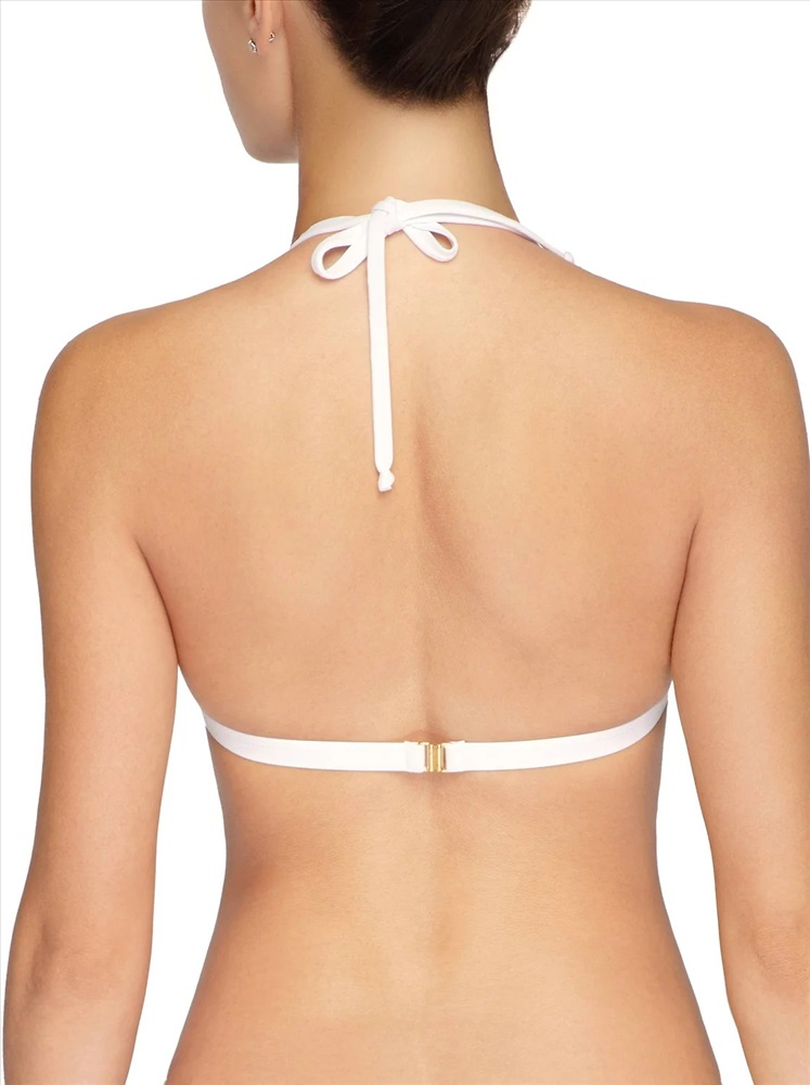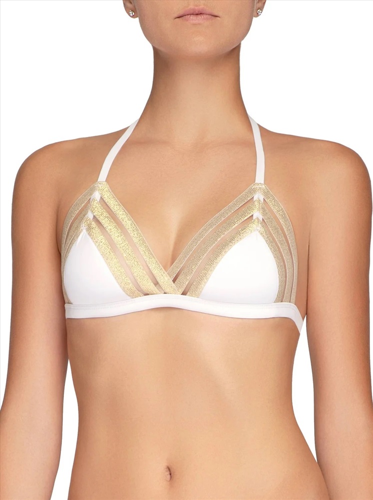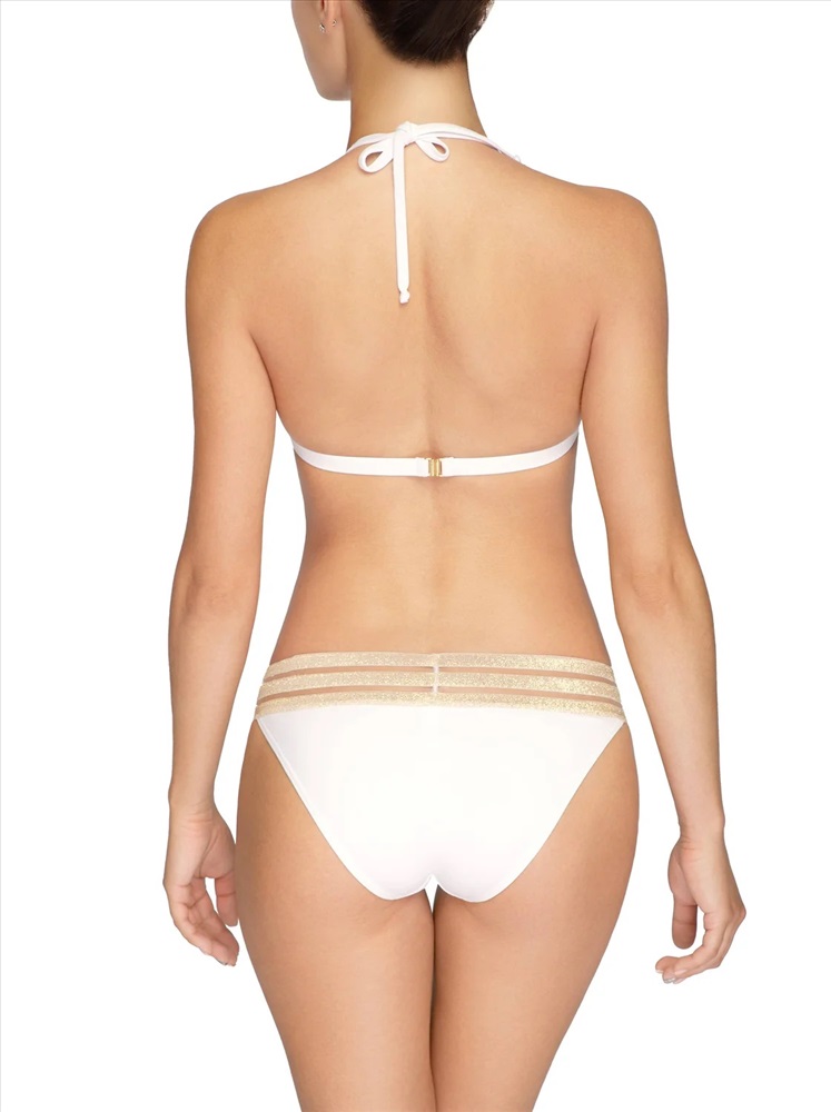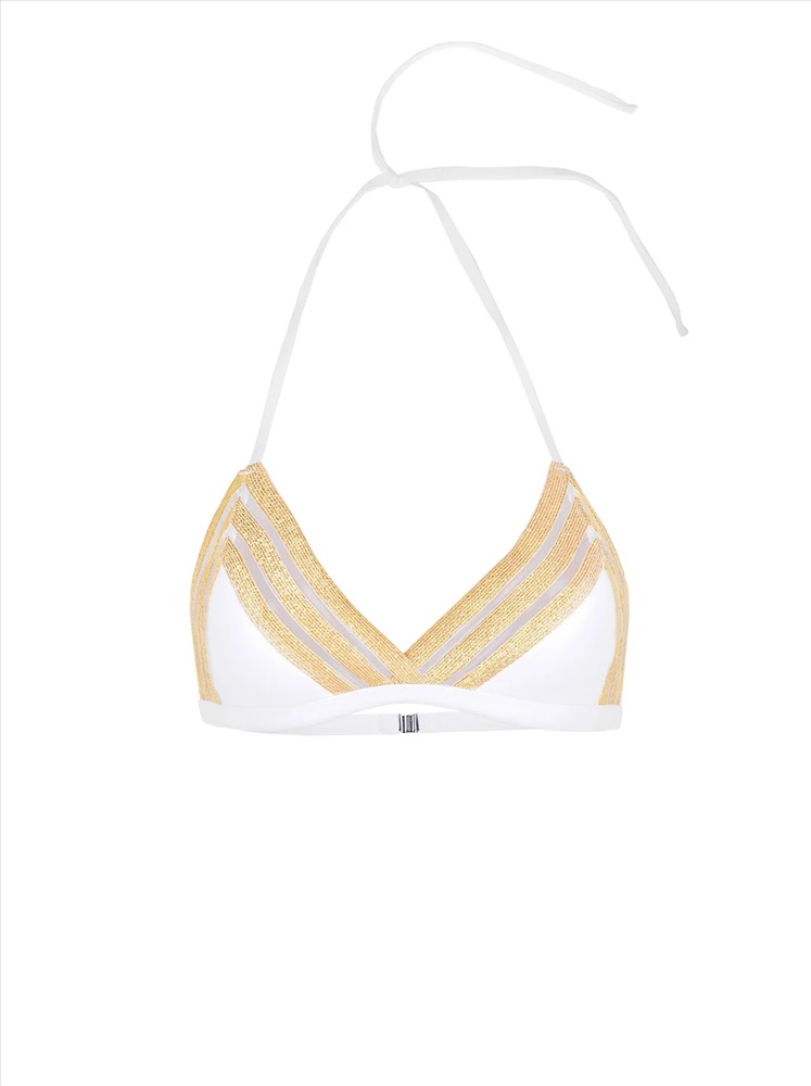Шикарный белый лиф с отделкой из декоративной золотой резинки. Эффектно смотрится на загорелом теле и подчеркивает соблазнительные формы. Фиксируется при помощи застежки на спине и завязок на шее.