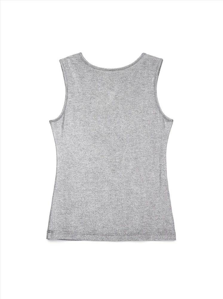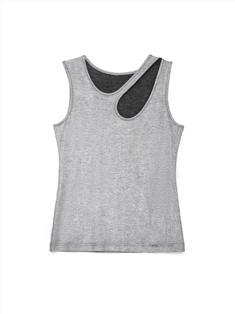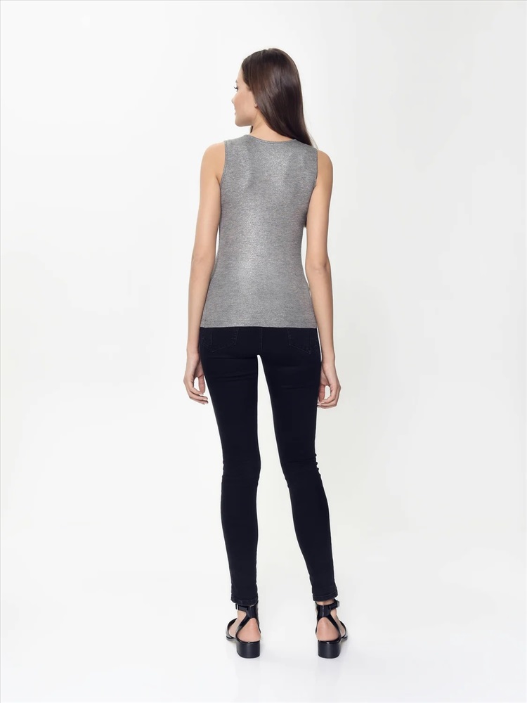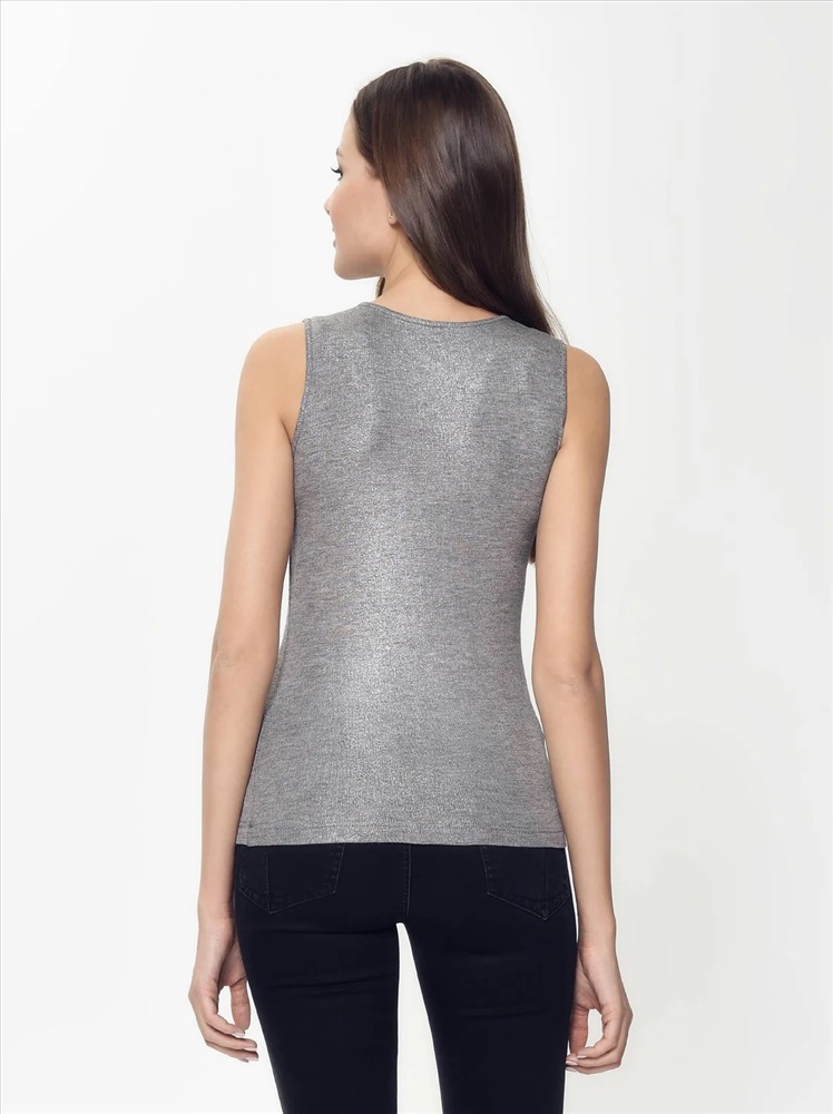 Стильный топ создан из легкого, мягкого и приятного к телу трикотажного полотна с высоким содержанием вискозы. Изюминку в летний образ привнесет напыление «мерцающее серебро» и фантазийный вырез «капелька».