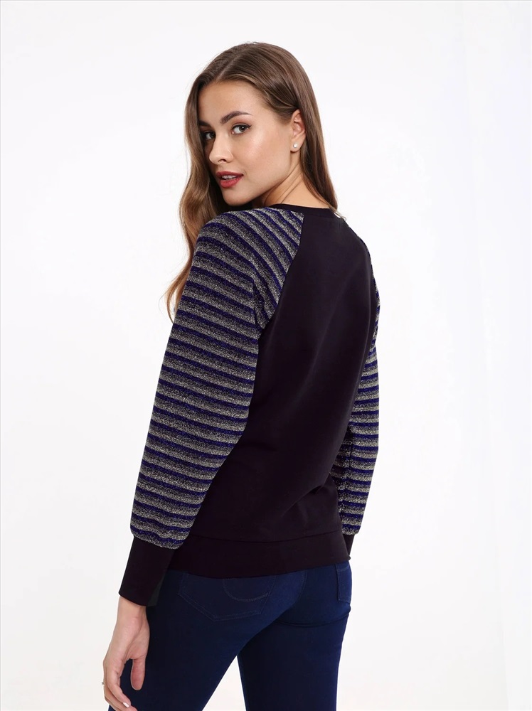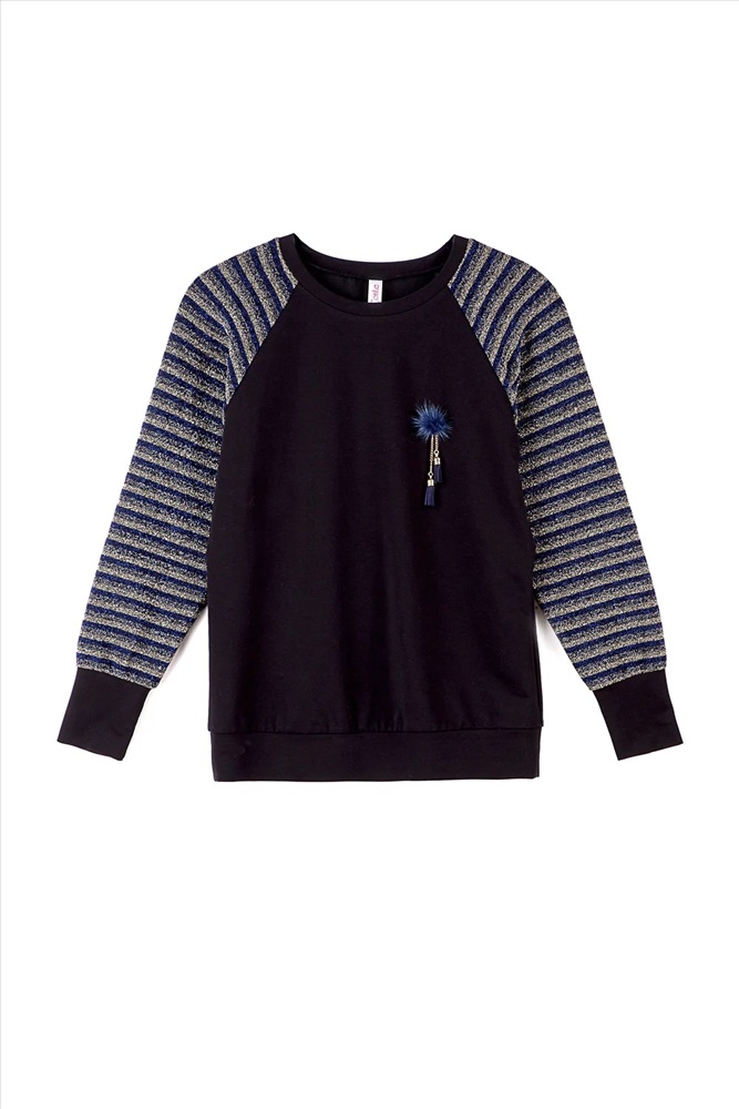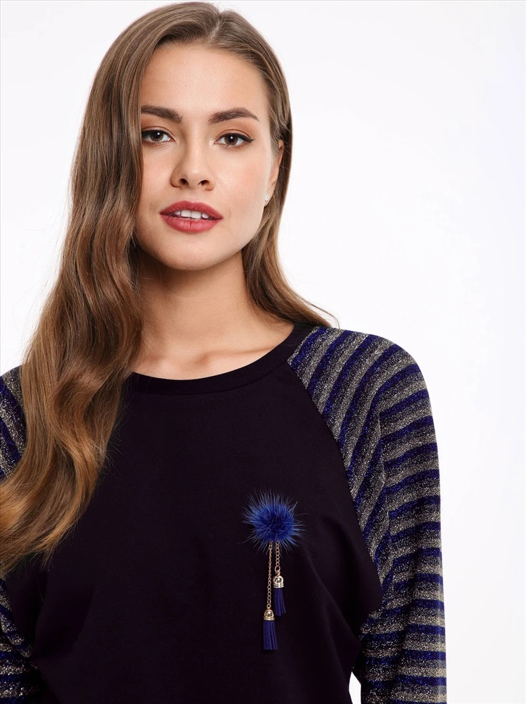 Рукава «реглан» с отделкой люрексом очаруют вас металлическими полосами, а меховая брошь с оригинальной подвеской добавят вашему образу изюминку.